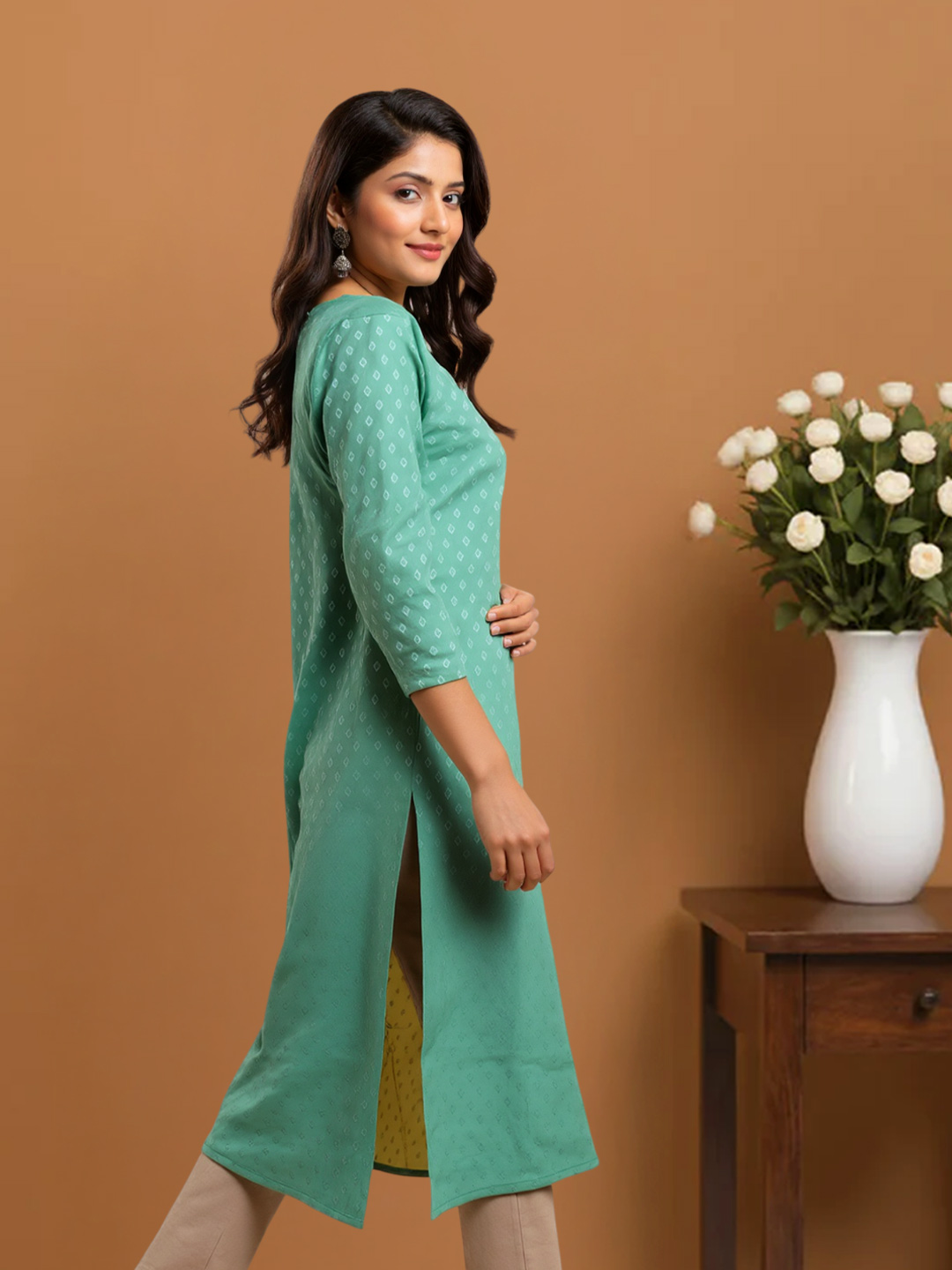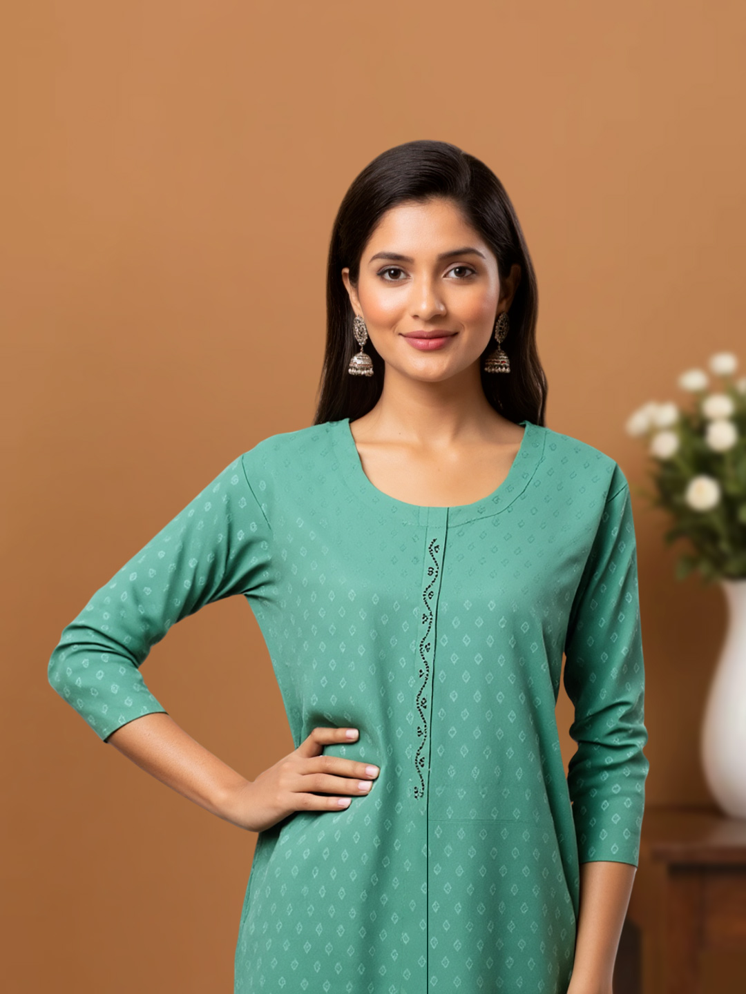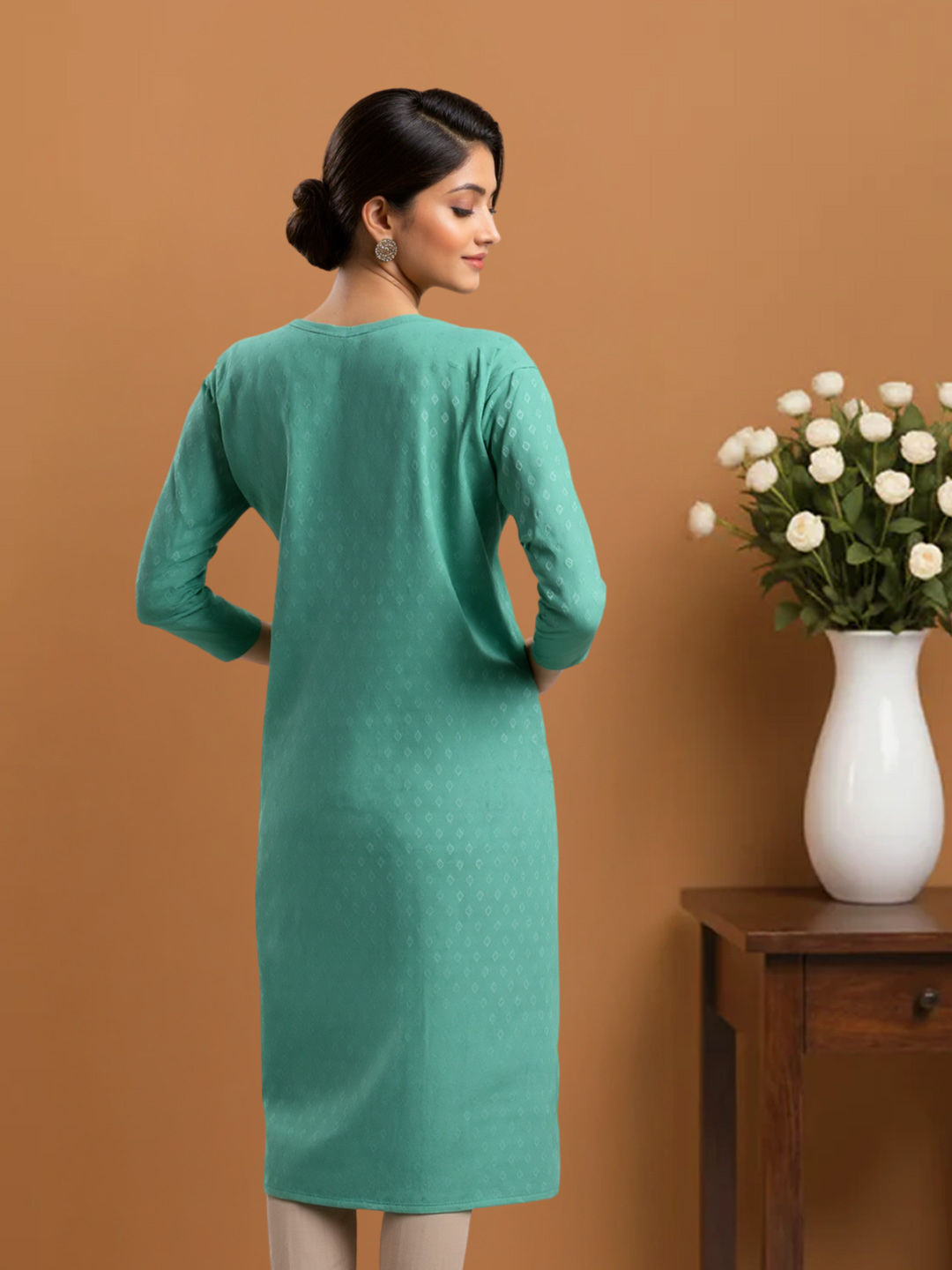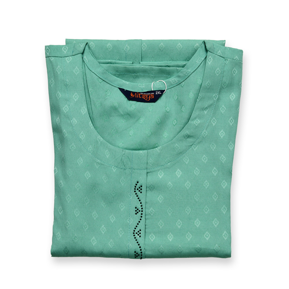 The beautifully rounded neckline creates a soft, feminine appeal. Subtle front detailing enhances the kurta’s charm, adding a touch of sophistication to your everyday style.