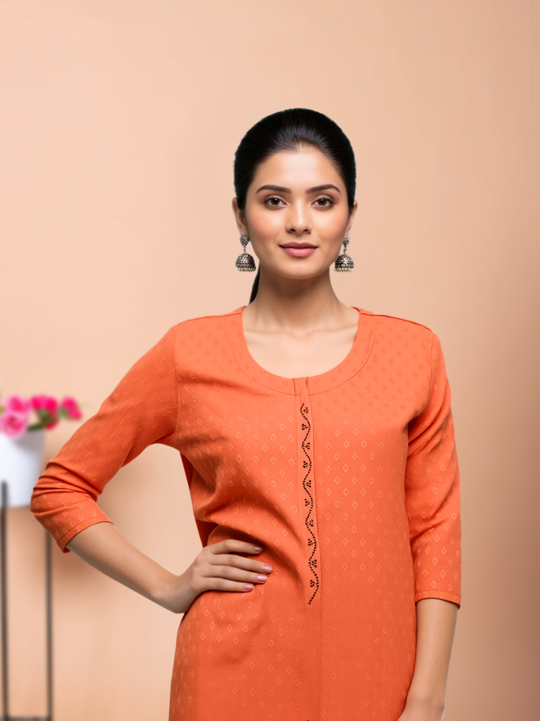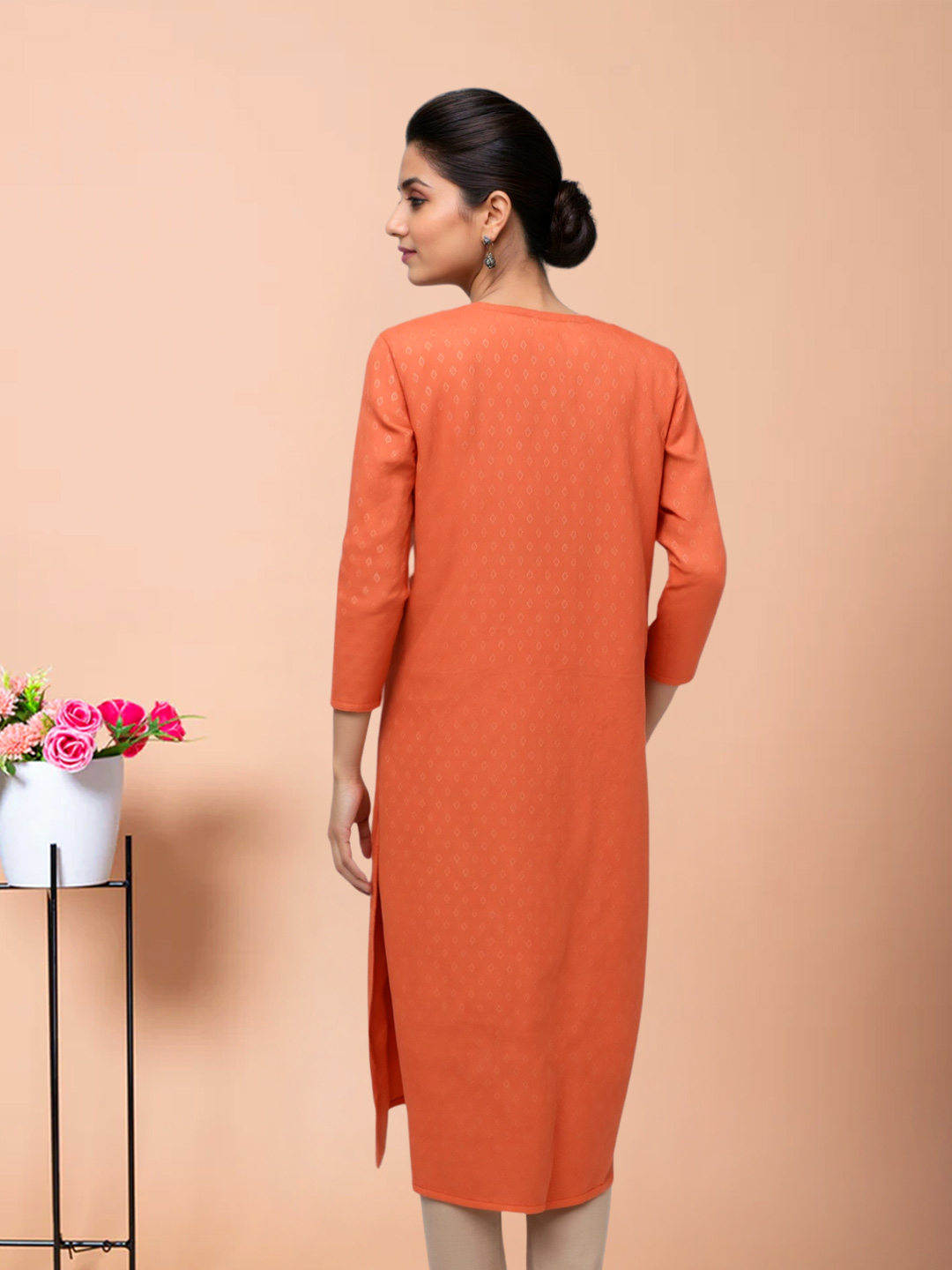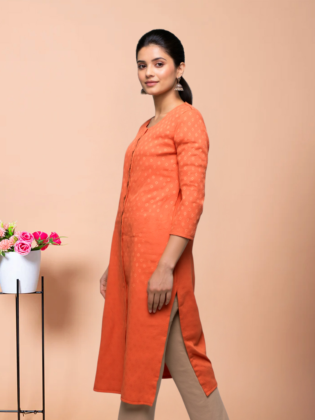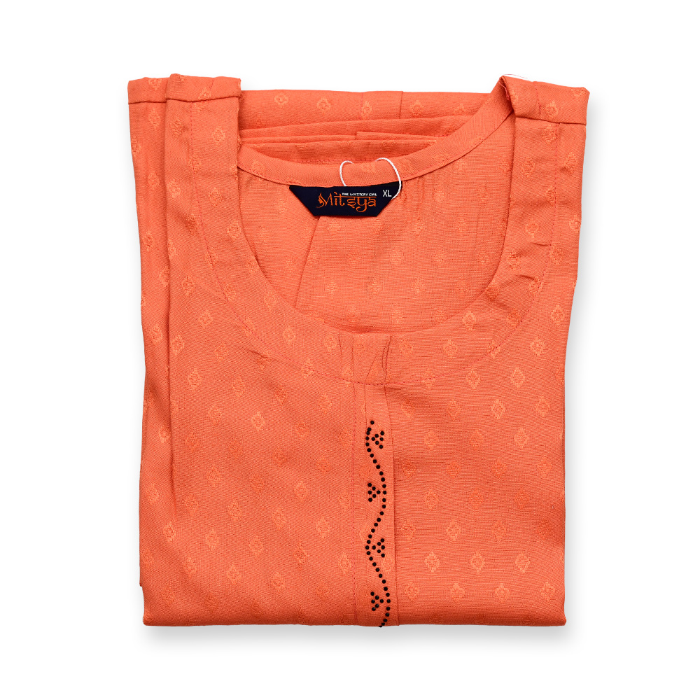 The beautifully rounded neckline creates a soft, feminine appeal. Subtle front detailing enhances the kurta’s charm, adding a touch of sophistication to your everyday style.