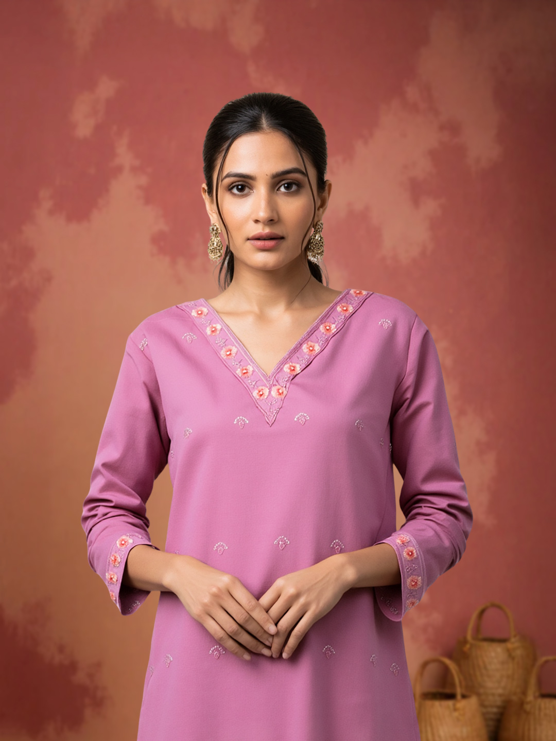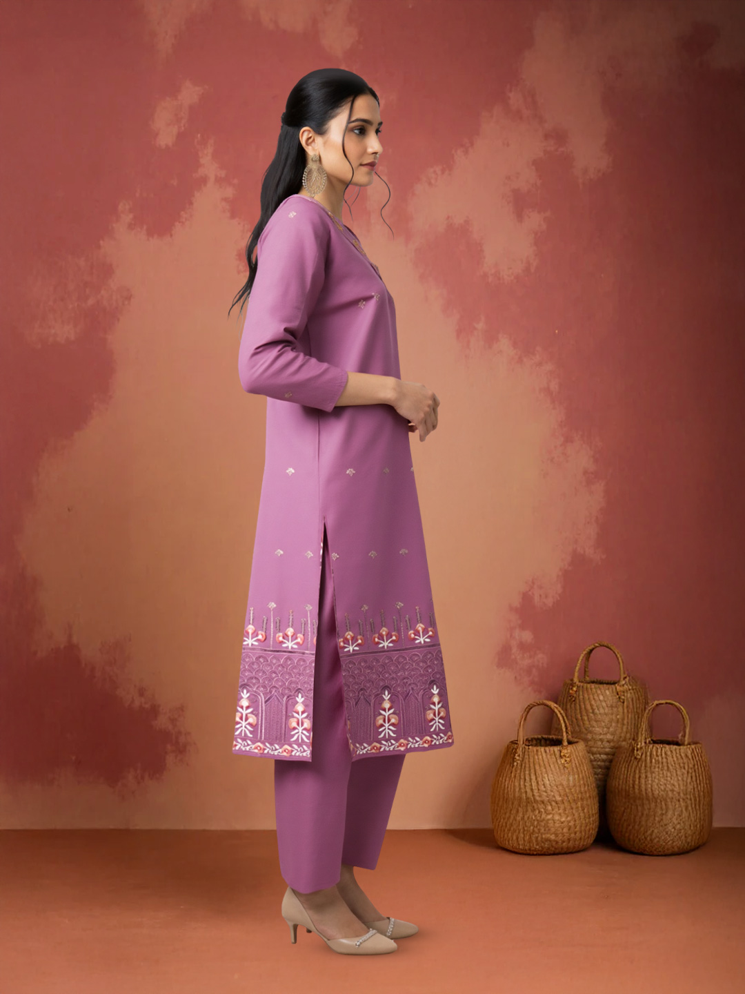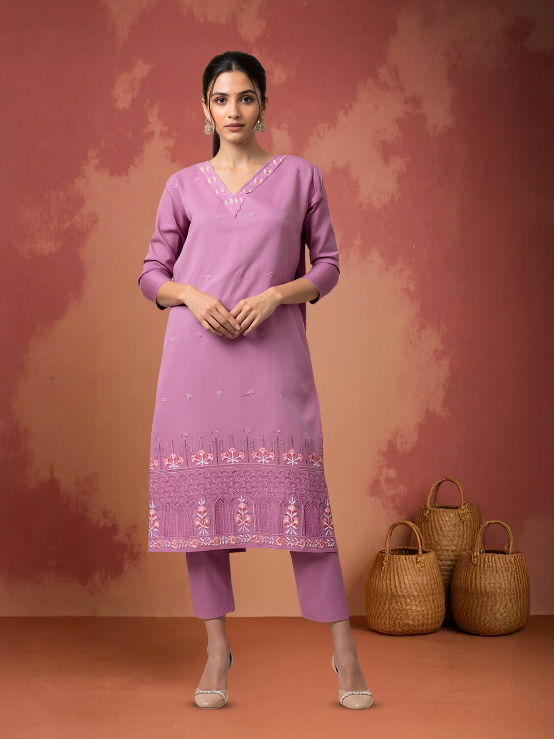 Experience the perfect blend of sophistication and comfort with this salwar suit set. The V-neck with delicate detailing, 3/4th sleeves, and structured straight-fit pants create a polished look. Enhanced with floral embroidery on the hemline and a dupatta featuring subtle ethnic prints, this ensemble embodies graceful femininity.