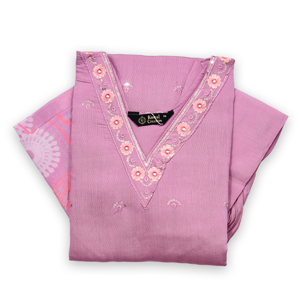 Elevate your wardrobe with this stunning V-neck embroidered set. Featuring a flattering neckline, 3/4 sleeves, and scattered motifs, it balances elegance with ease. Intricate hemline embroidery, structured straight-fit pants, and a dupatta with subtle ethnic prints complete this sophisticated look for weddings, festivals, or casual celebrations.