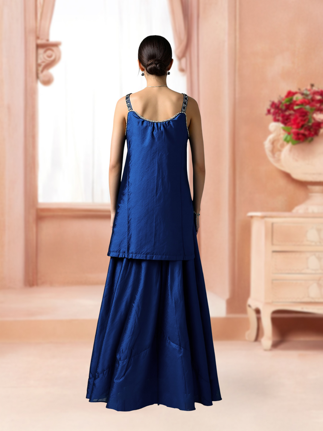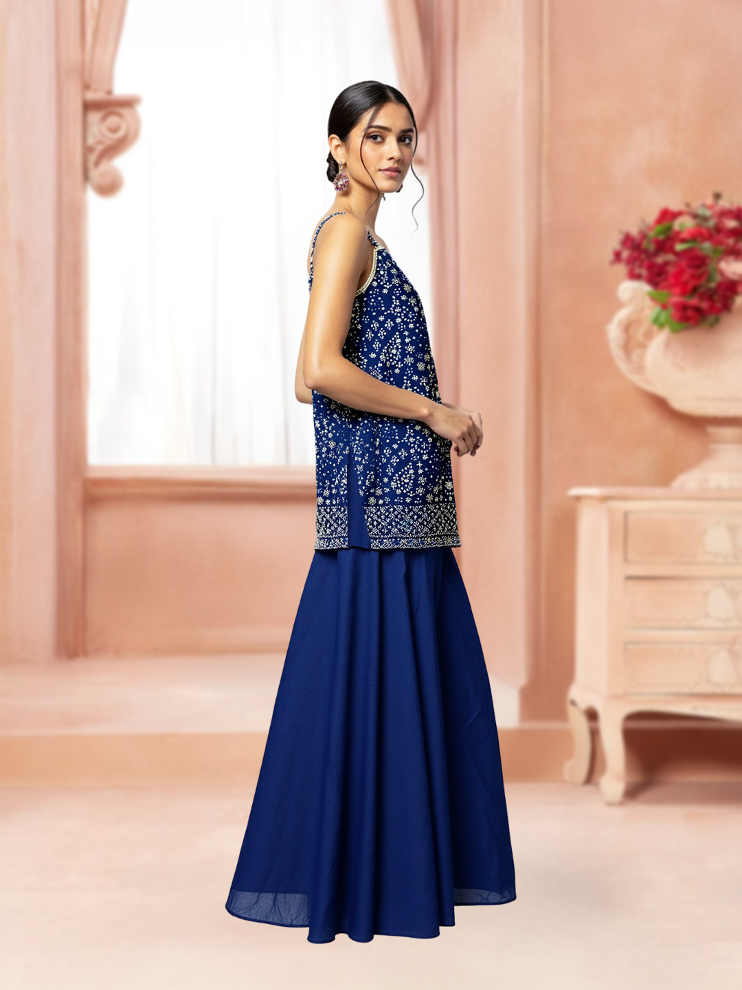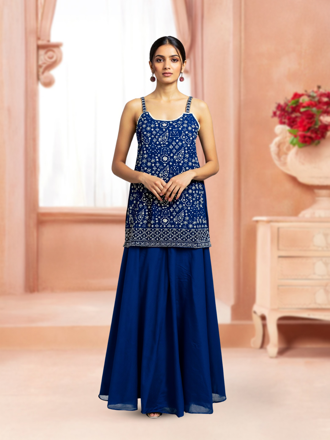 The matching wide-leg sharara pants combine elegance with ease, allowing effortless movement without compromising on style. The perfectly coordinated bottom makes it ideal for long festive celebrations.