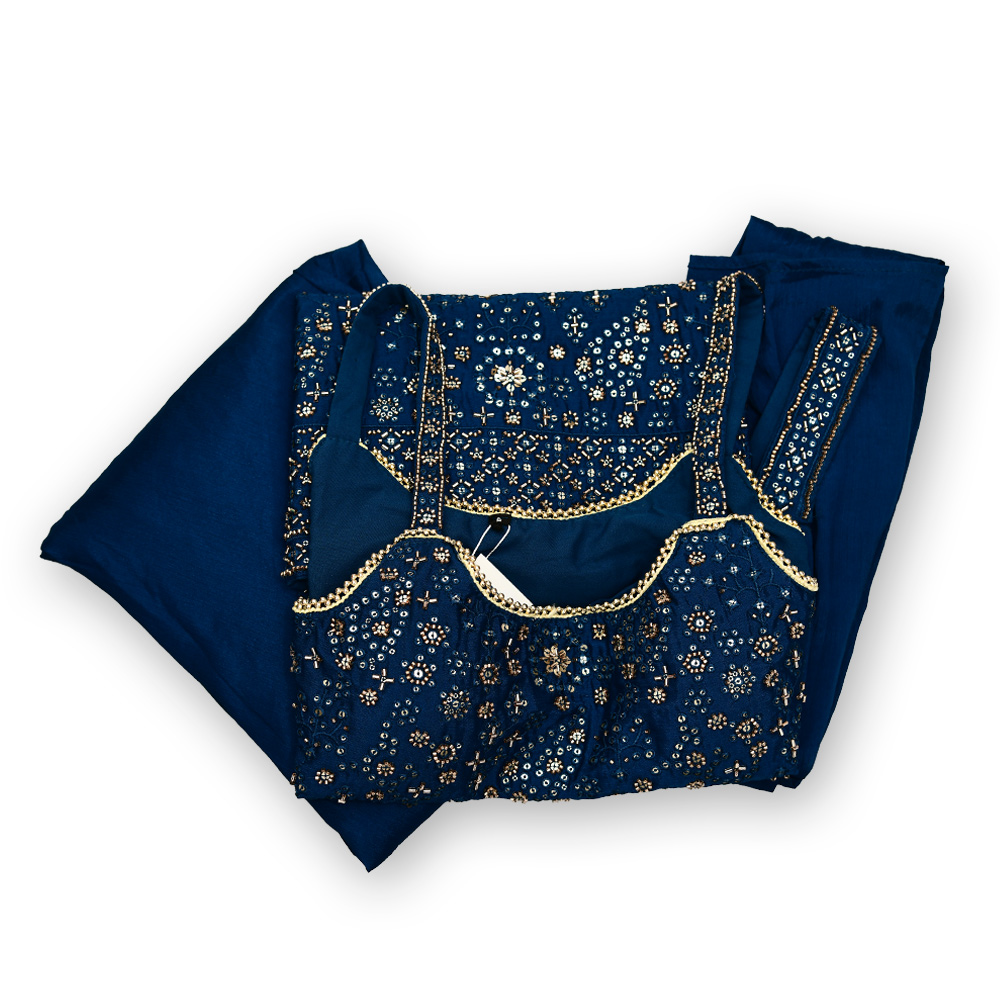 The scoop neckline is enhanced with a coordinated embroidered choker-style neck, blending traditional artistry with contemporary flair. A statement feature that elevates the outfit instantly.