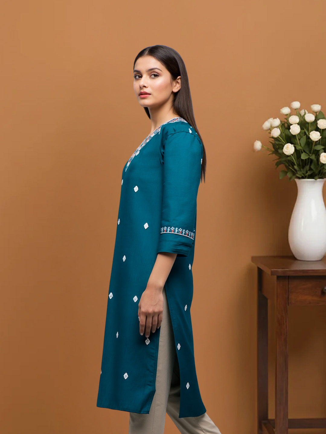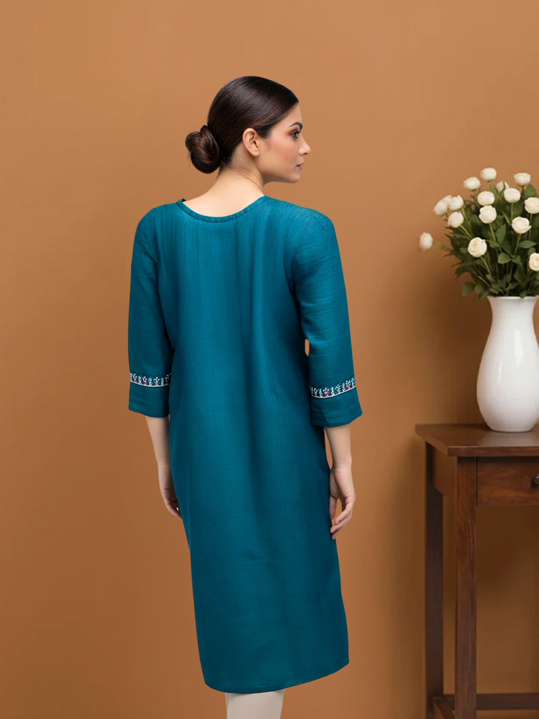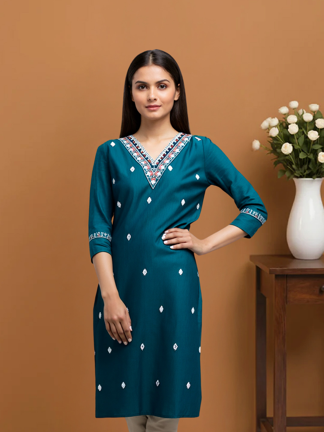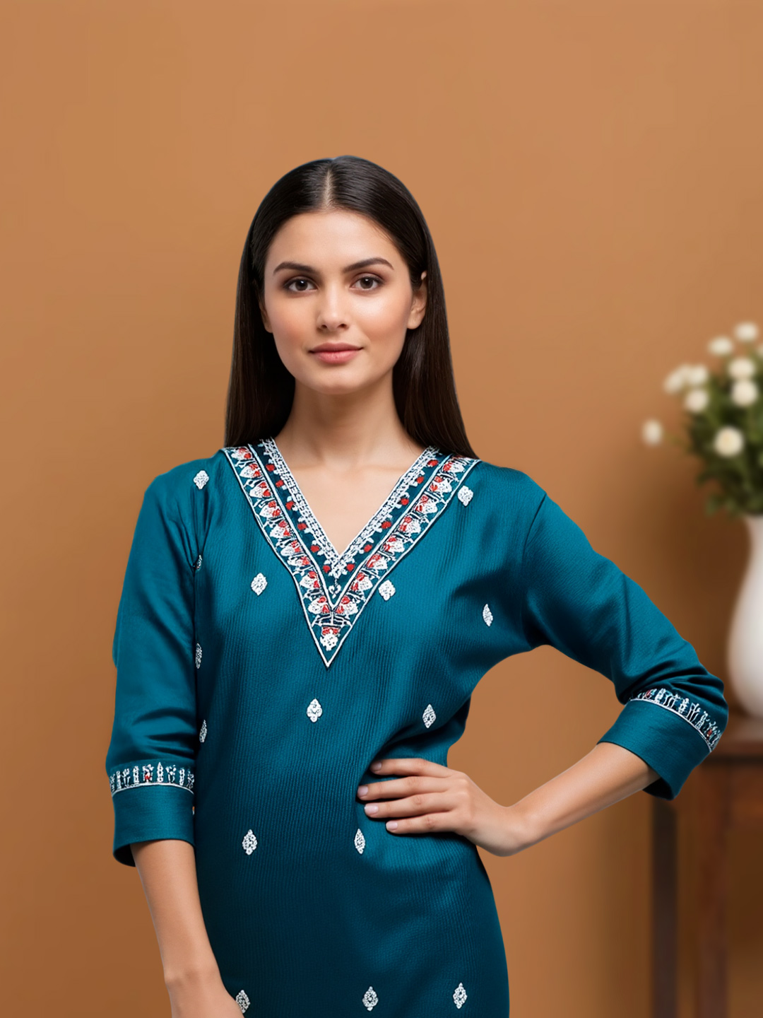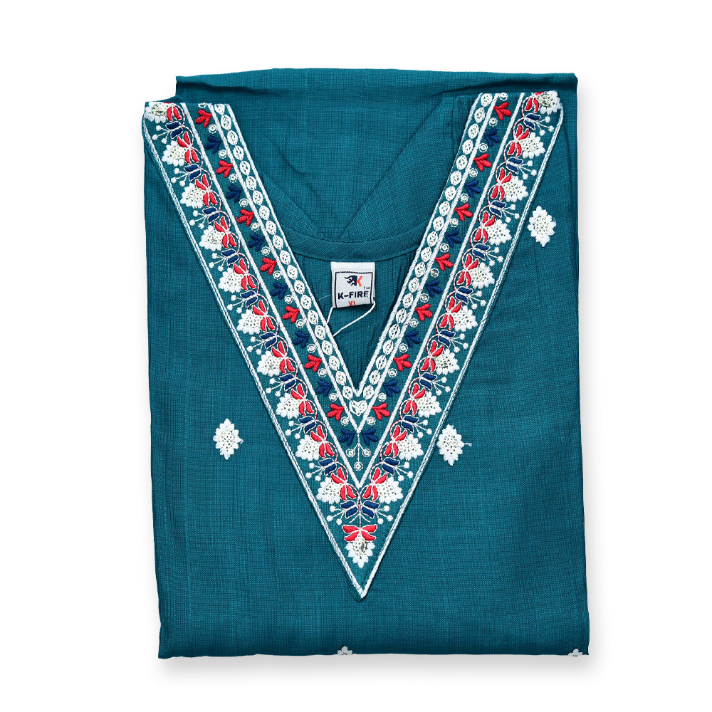 The V-neckline adds a modern touch while flattering every face shape, enhancing the kurta’s graceful and feminine appeal.