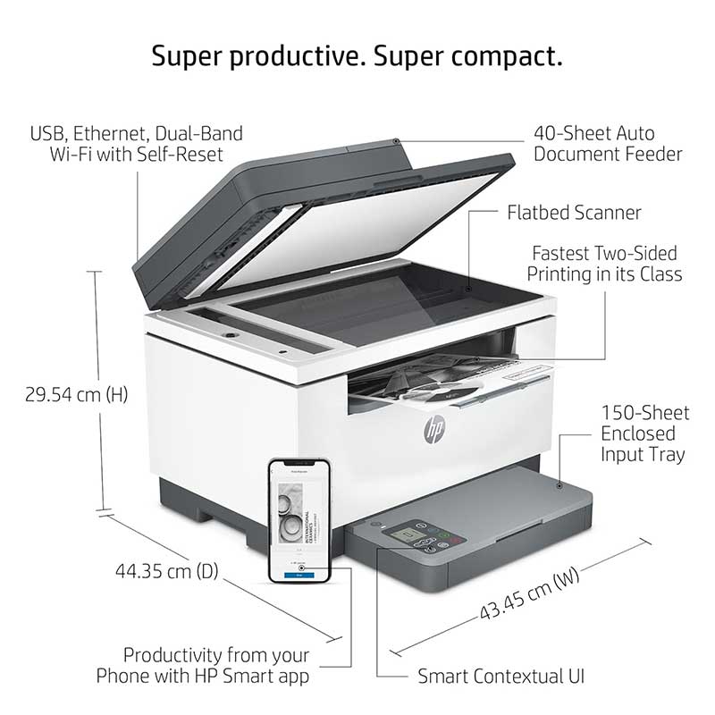 Stay connected your way – with Self-Reset Dual Band Wi-Fi, Ethernet, and mobile printing via the HP Smart App.
