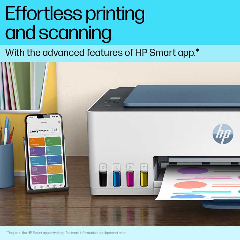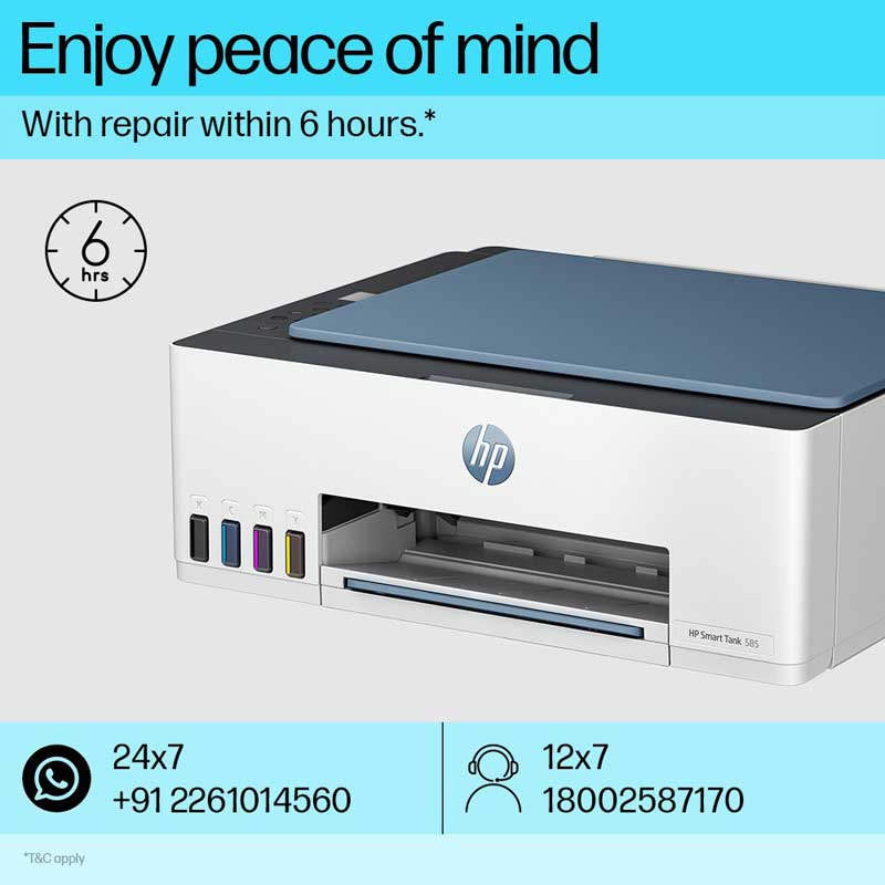 Offering hassle-free mobile setup, guided buttons, two-sided printing, low-on-ink sensors, self-healing Wi-Fi, and exceptional quality prints, the HP Smart Tank 585 All-in-one Colour Printer offers enhanced productivity.