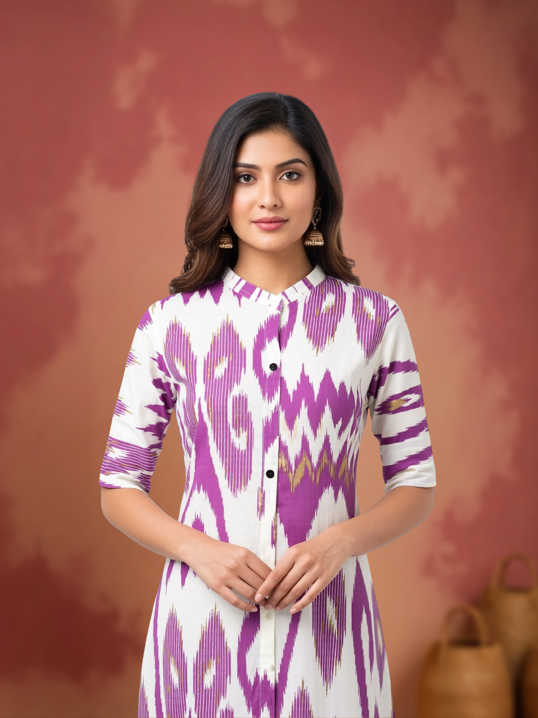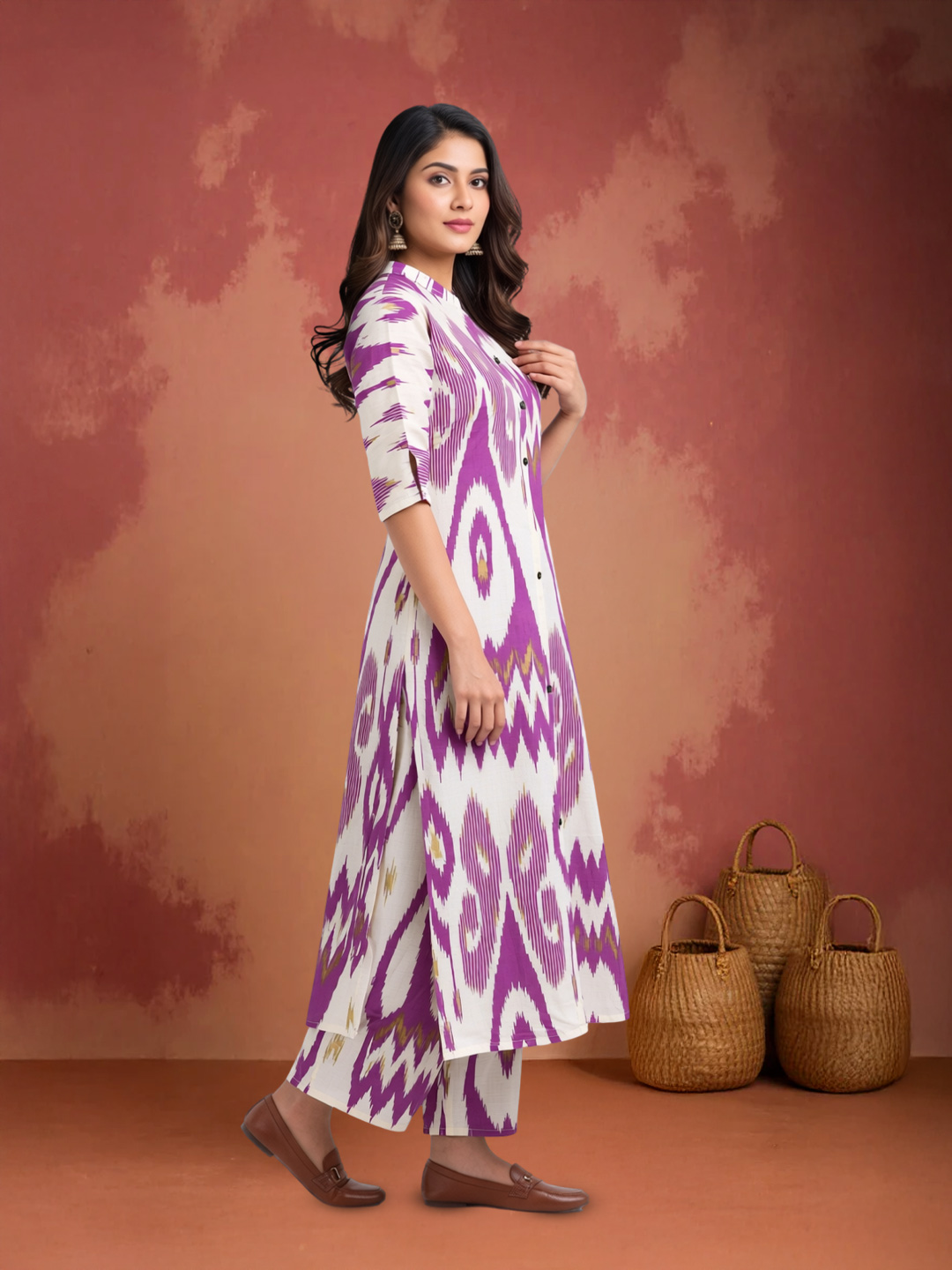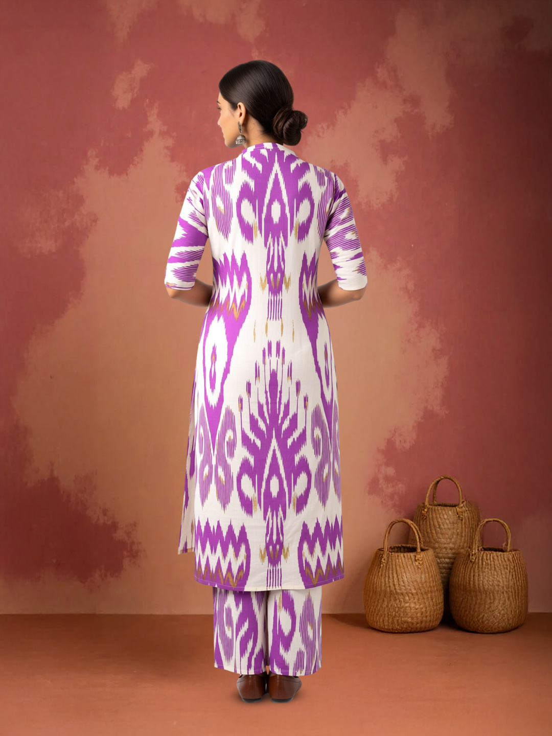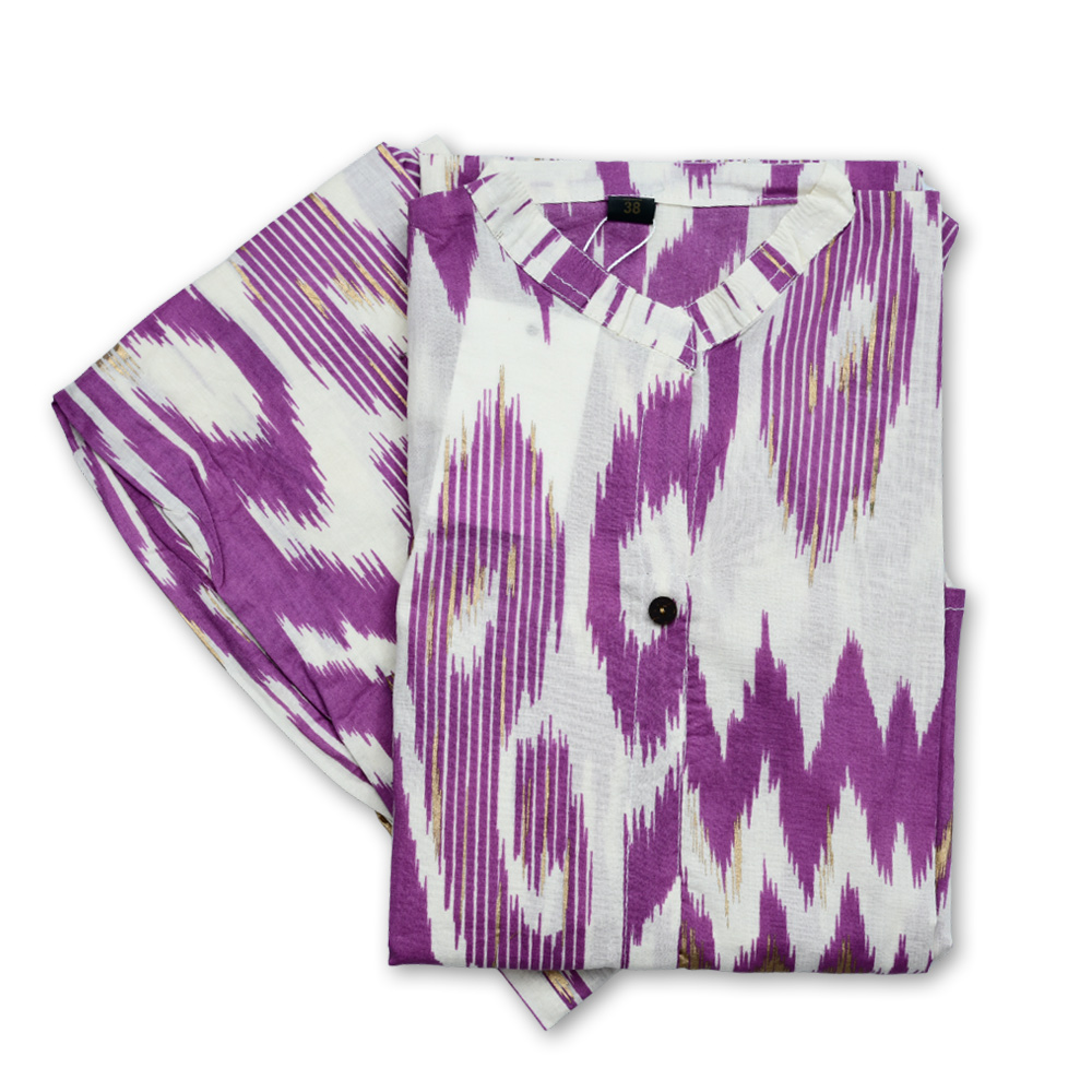 Step into effortless style with this ikat printed kurta-palazzo set. The purple and white ikat pattern with subtle golden accents adds a touch of sophistication, while the lightweight, breathable fabric ensures all-day comfort. The mandarin collar and full button-down front elevate its chic appeal.