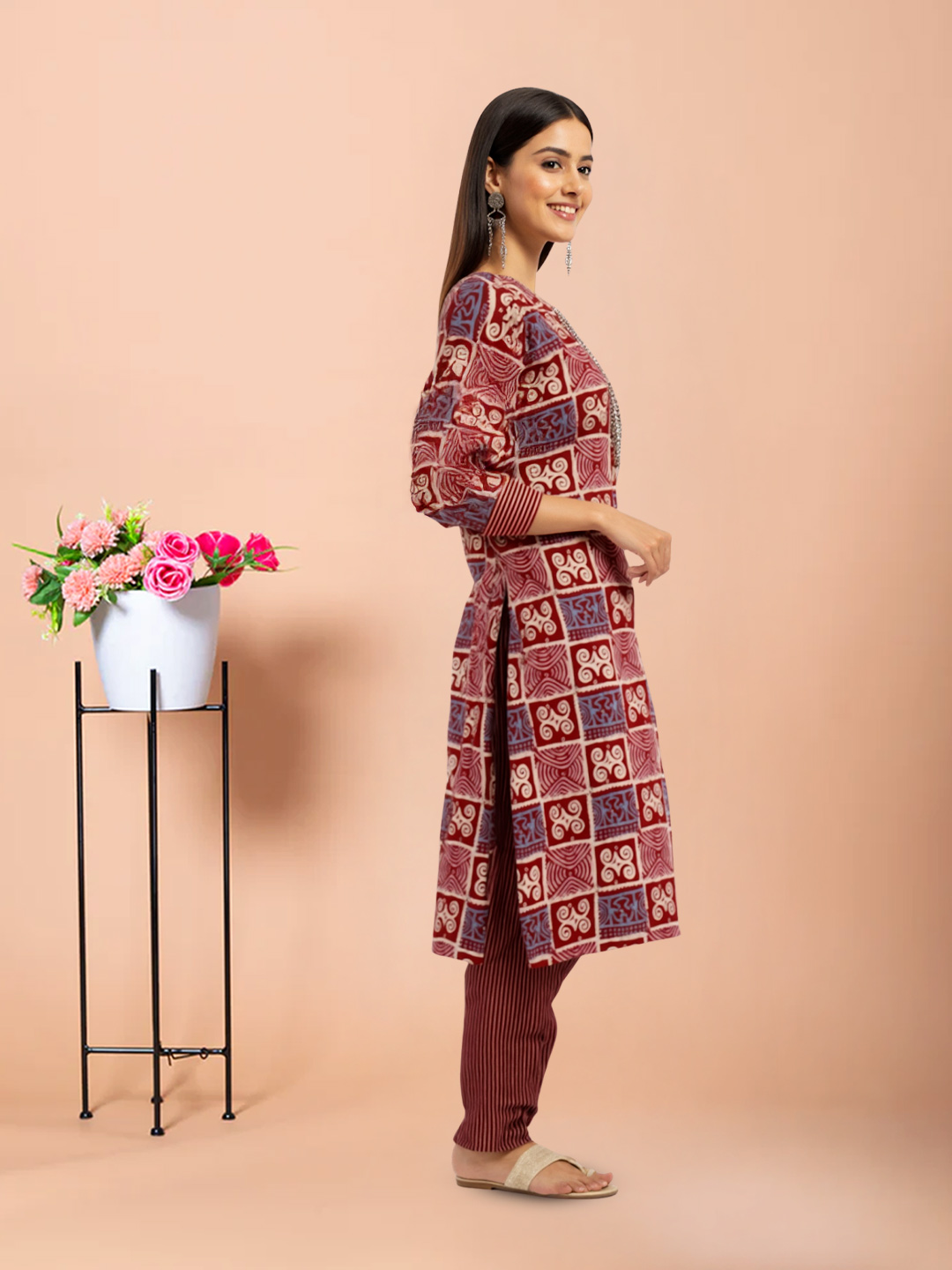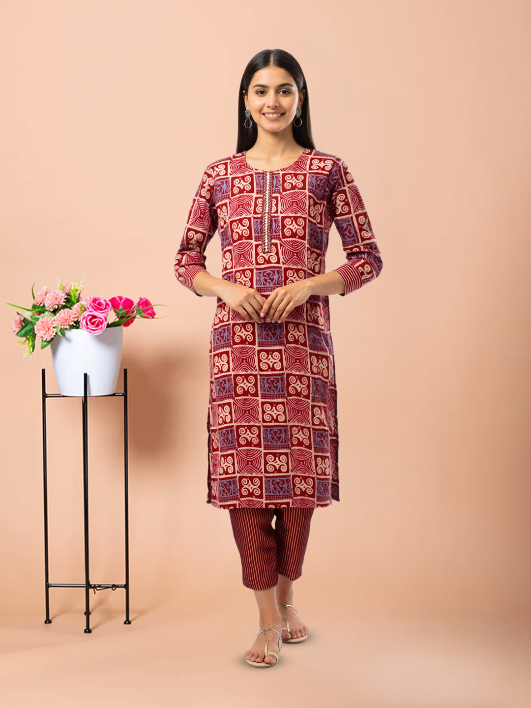 A blend of intricate block prints and modern tailoring, this Kurta with Pant Dupatta Set makes a statement without saying a word. The traditional block prints stand out beautifully against the premium fabric, while the round neck and 3/4 sleeves provide a universally flattering fit. The ensemble is completed with a matching straight pant and a lightweight dupatta, making it the perfect choice for a woman who values comfort, versatility, and style.