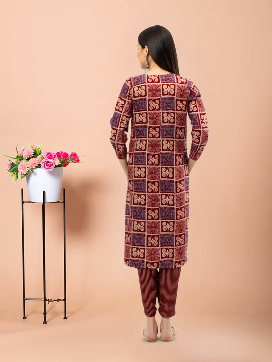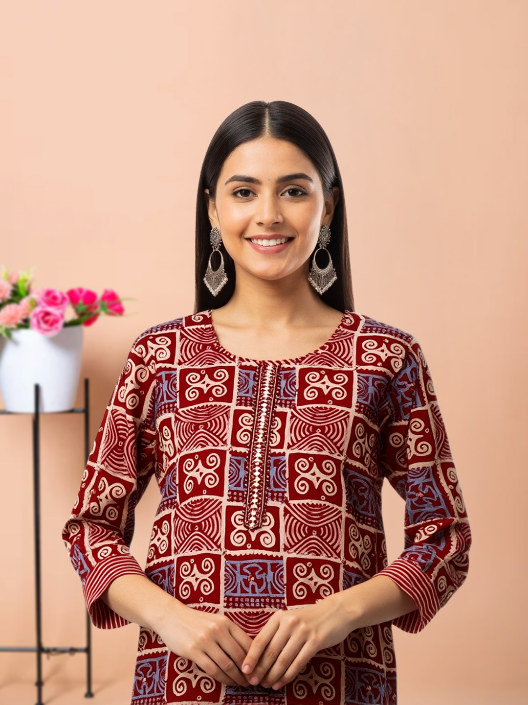 Whether you're dressing up for a casual gathering or a festive celebration, the Intricate Block Print Kurta Set is your go-to choice. The timeless block print pattern, paired with a round neck and 3/4 sleeves, offers a stylish yet comfortable fit. The matching straight pant is tailored to perfection, and the lightweight dupatta provides just the right amount of flow and grace. Add a touch of cultural sophistication to your wardrobe with this versatile ensemble.