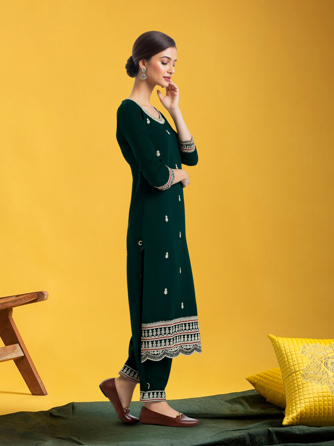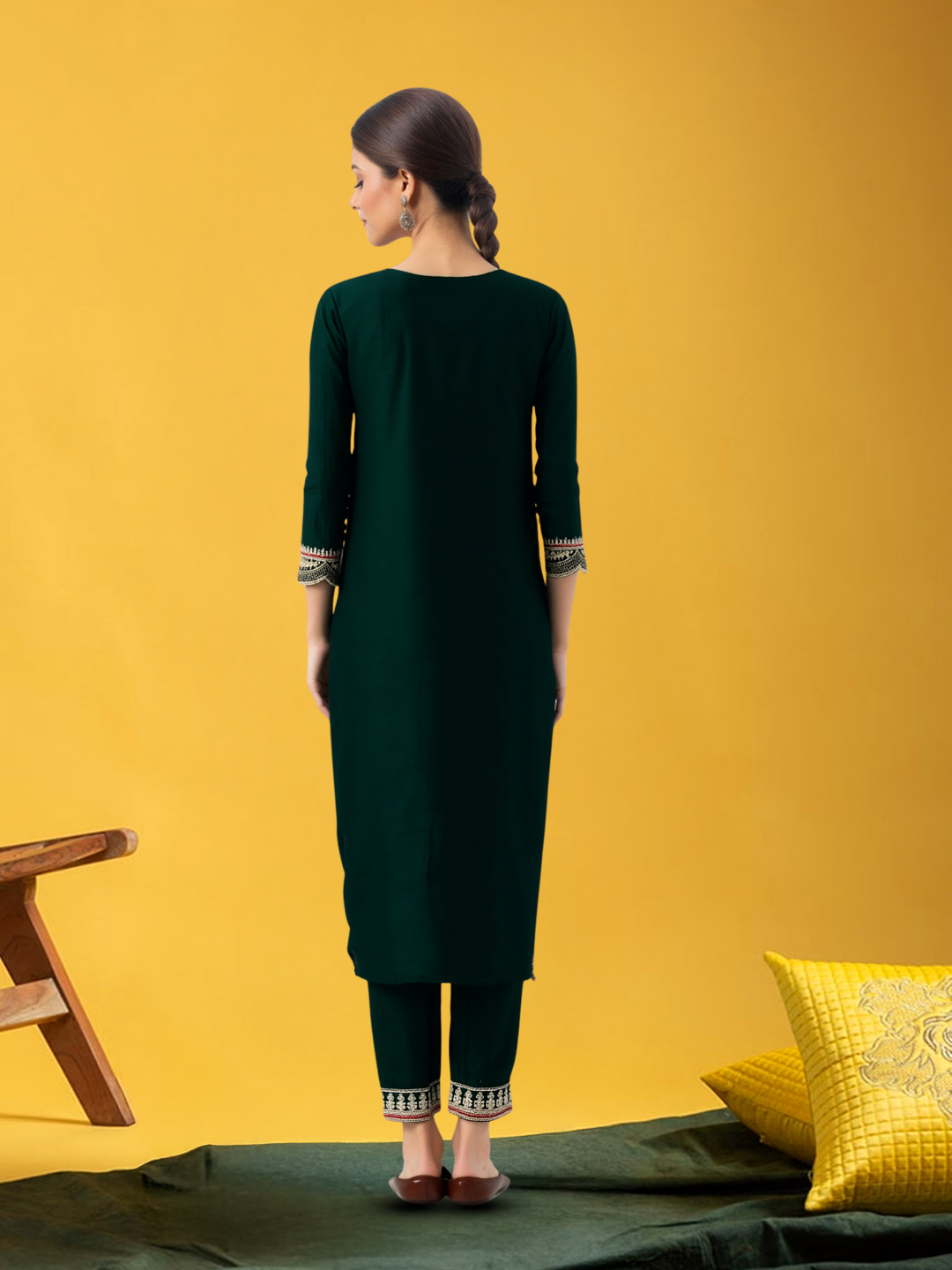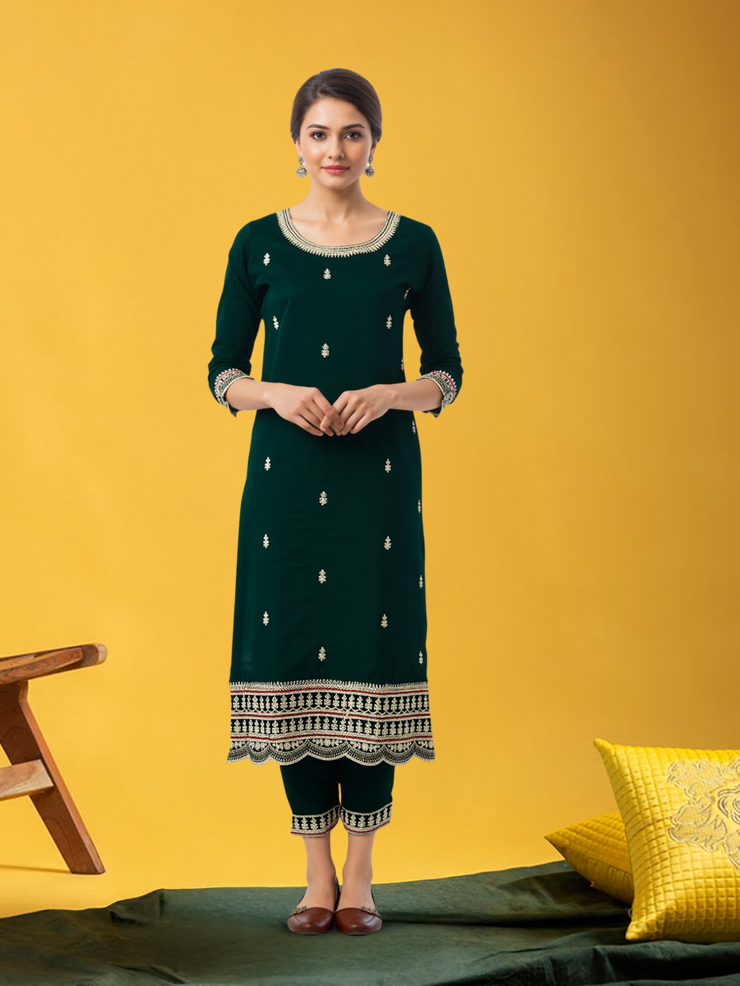 This elegant salwar suit set showcases detailed embroidery motifs on the kurta and dupatta, paired with three-quarter sleeves and a classic straight-fit silhouette. The coordinated pants with complementary borders complete a graceful and comfortable ethnic outfit perfect for celebrations.