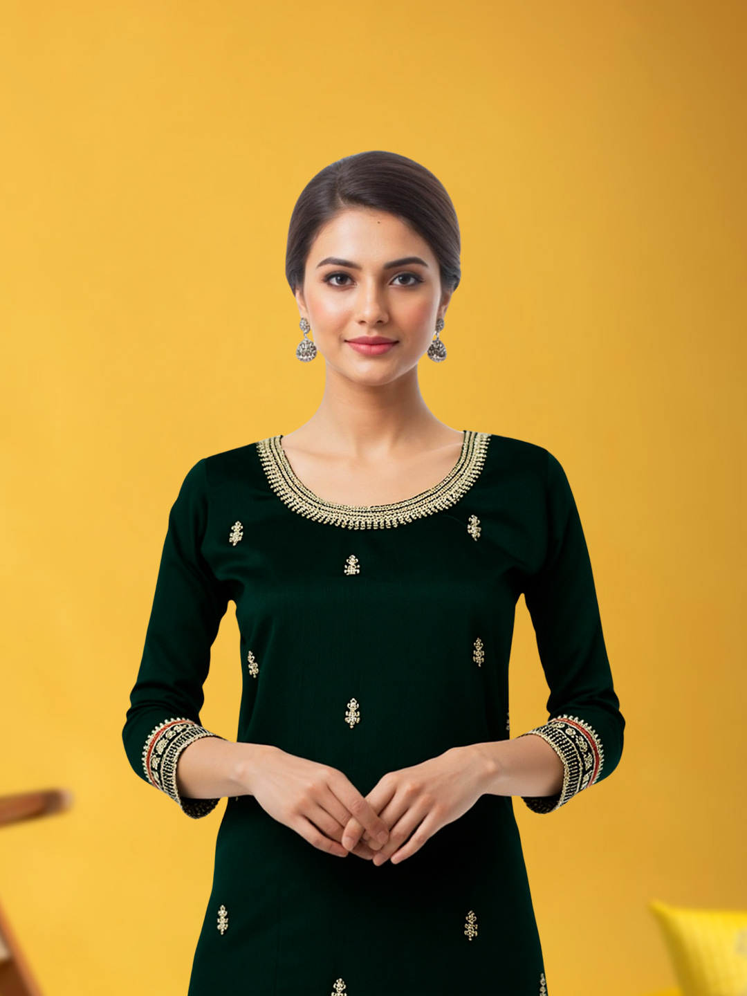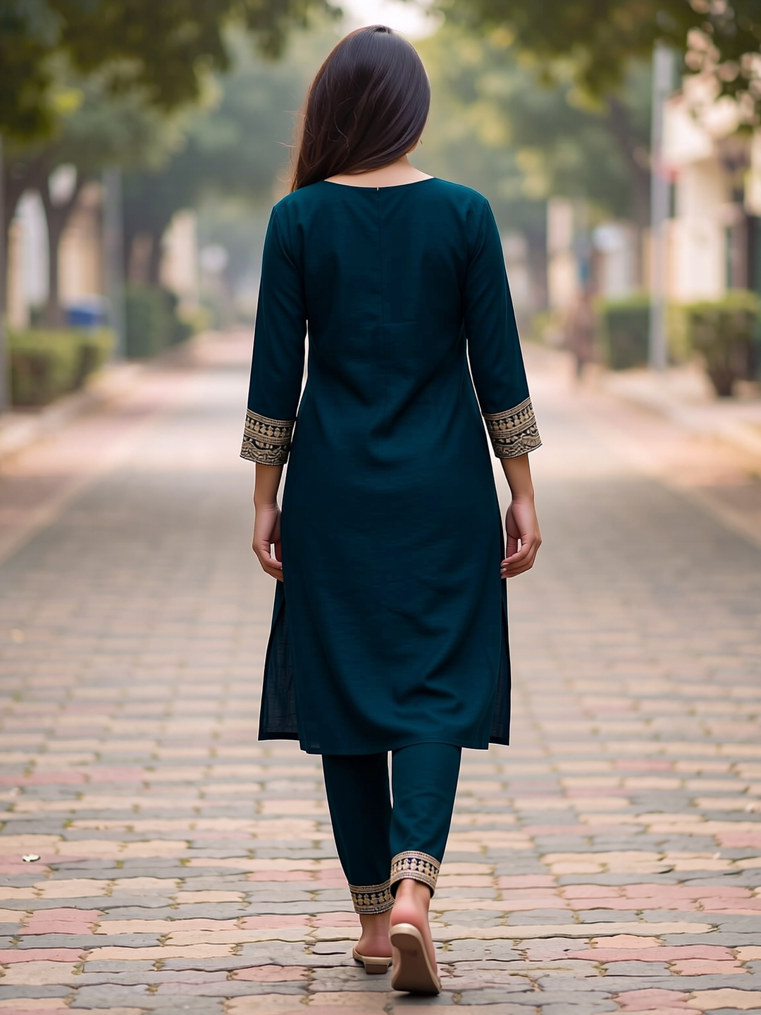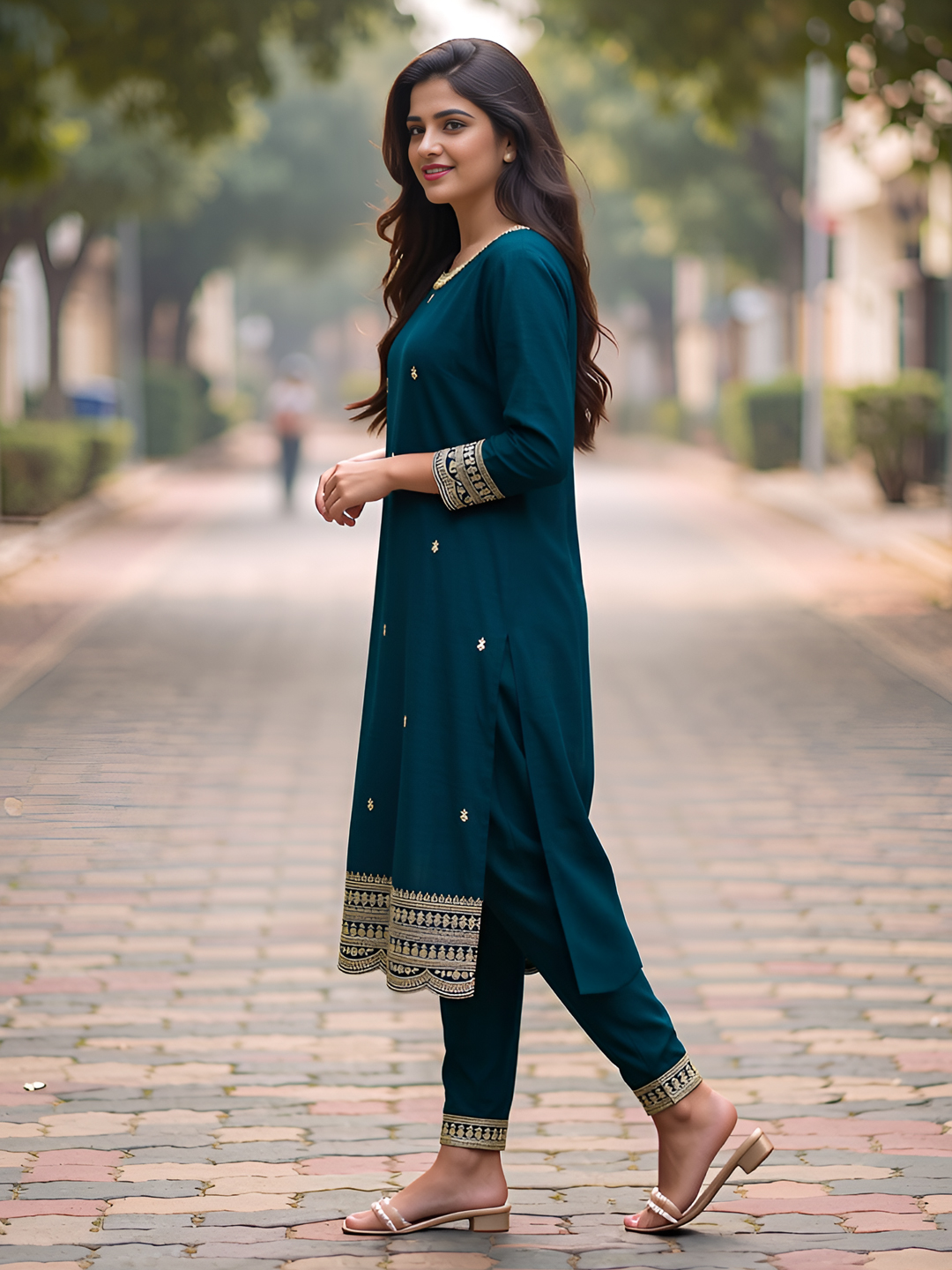 This elegant salwar suit set showcases detailed embroidery motifs on the kurta and dupatta, paired with three-quarter sleeves and a classic straight-fit silhouette. The coordinated pants with complementary borders complete a graceful and comfortable ethnic outfit perfect for celebrations.