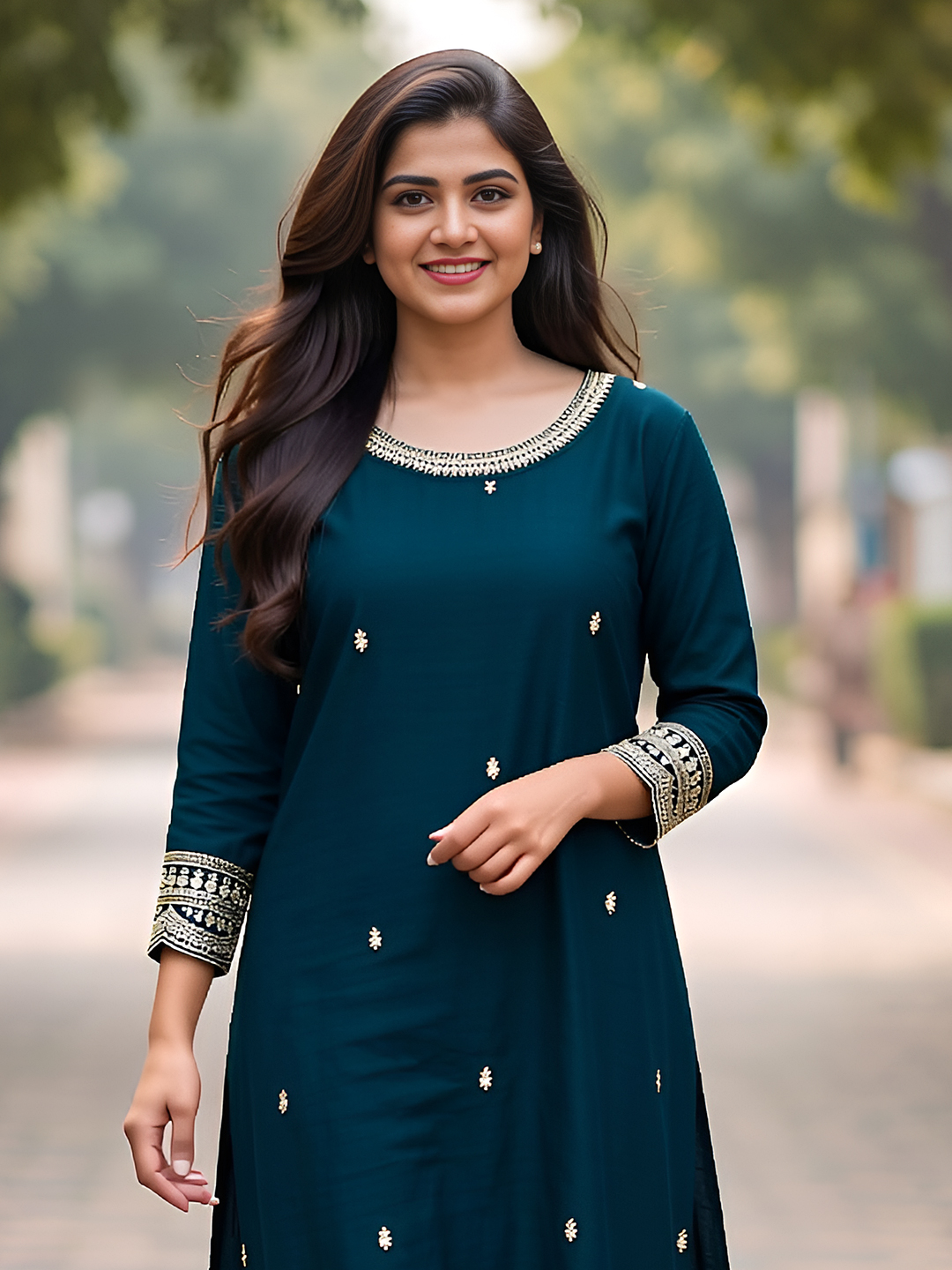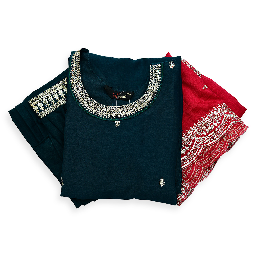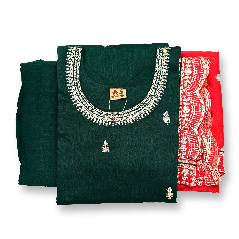 Perfect for casual or festive occasions, this salwar suit set combines premium breathable fabric with delicate embroidery. The straight-cut kurta, three-quarter sleeves, matching pants, and scalloped embroidered dupatta offer comfort, style, and timeless ethnic appeal.