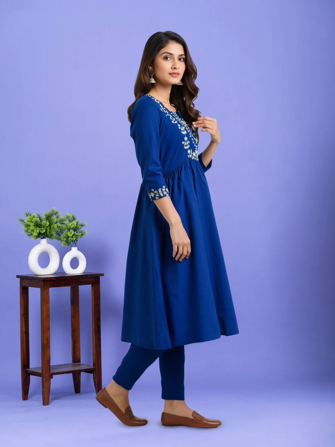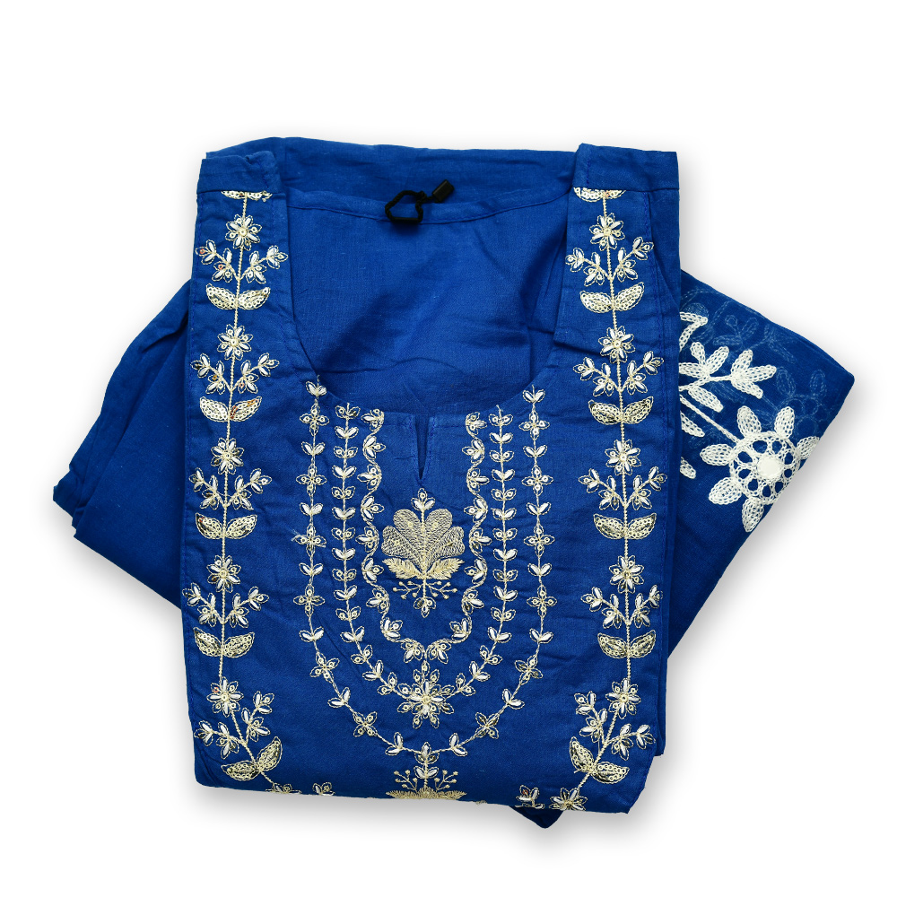 Rendered in a deep royal blue shade, this salwar suit makes a bold yet classy statement. The rich color perfectly complements the white embroidery for a striking contrast.