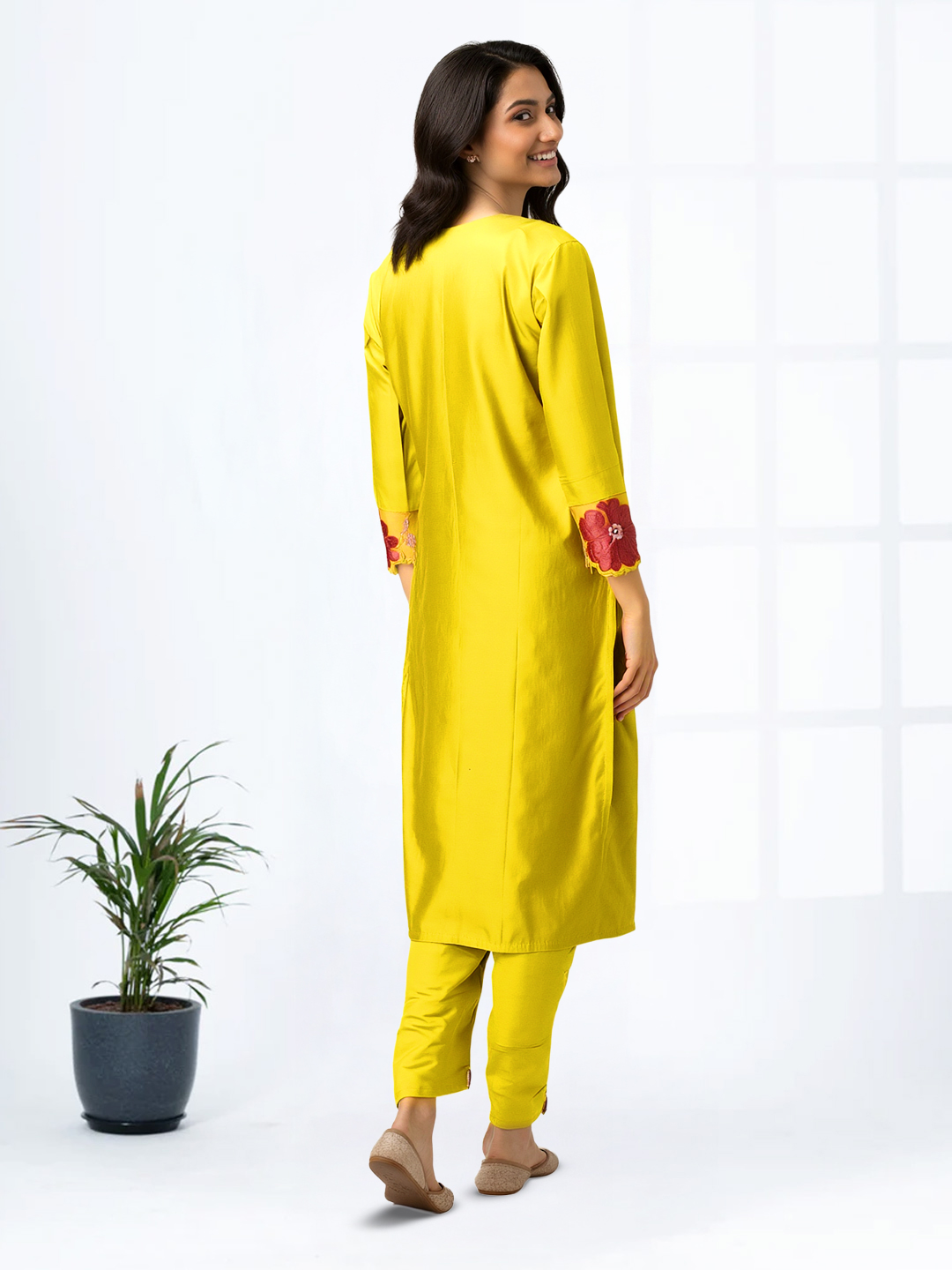 Turn heads with a kurta that tells a story — featuring a cascade of intricate floral embroidery from shoulder to hem. This ensemble captures timeless elegance with modern charm, perfect for festive gatherings or intimate celebrations.