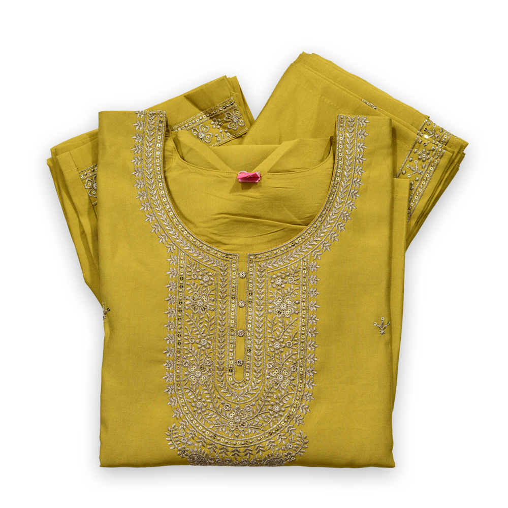 Step into classic beauty with this Intricately Embroidered Traditional Salwar Suit Set. The richly embroidered neckline showcases traditional artistry, while subtle front motifs add charm and sophistication. The three-quarter sleeves with embroidered cuffs elevate the look, paired with matching churidar pants featuring coordinated embroidery. A lightweight dupatta with an elegant embroidered border completes this graceful ensemble.