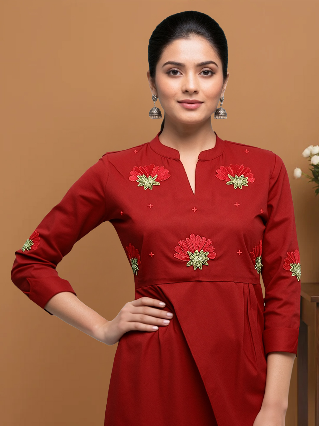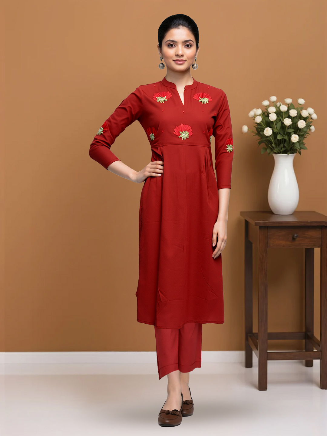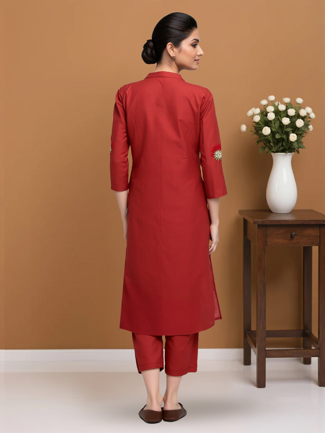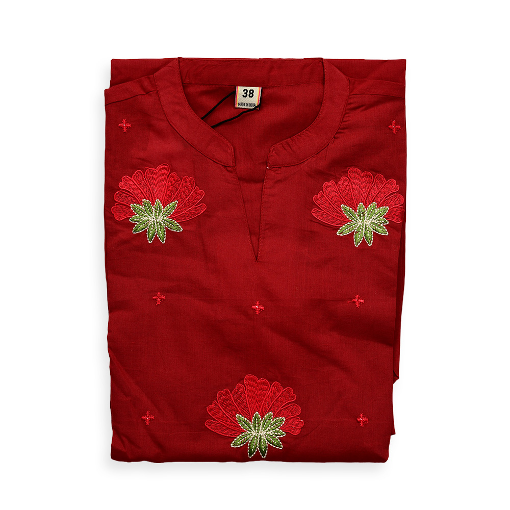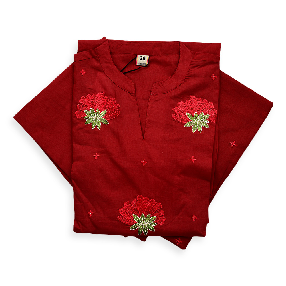 Elevate your ethnic wardrobe with this Mandarin-collar salwar suit featuring delicate floral embroidery on the yoke and sleeves. The 3/4 embroidered sleeves add charm, while the straight-fit pants and minimal dupatta create a look that’s effortlessly polished.