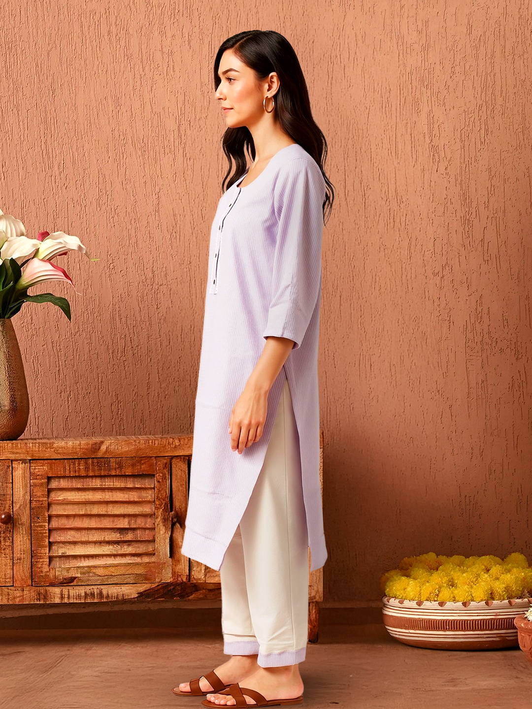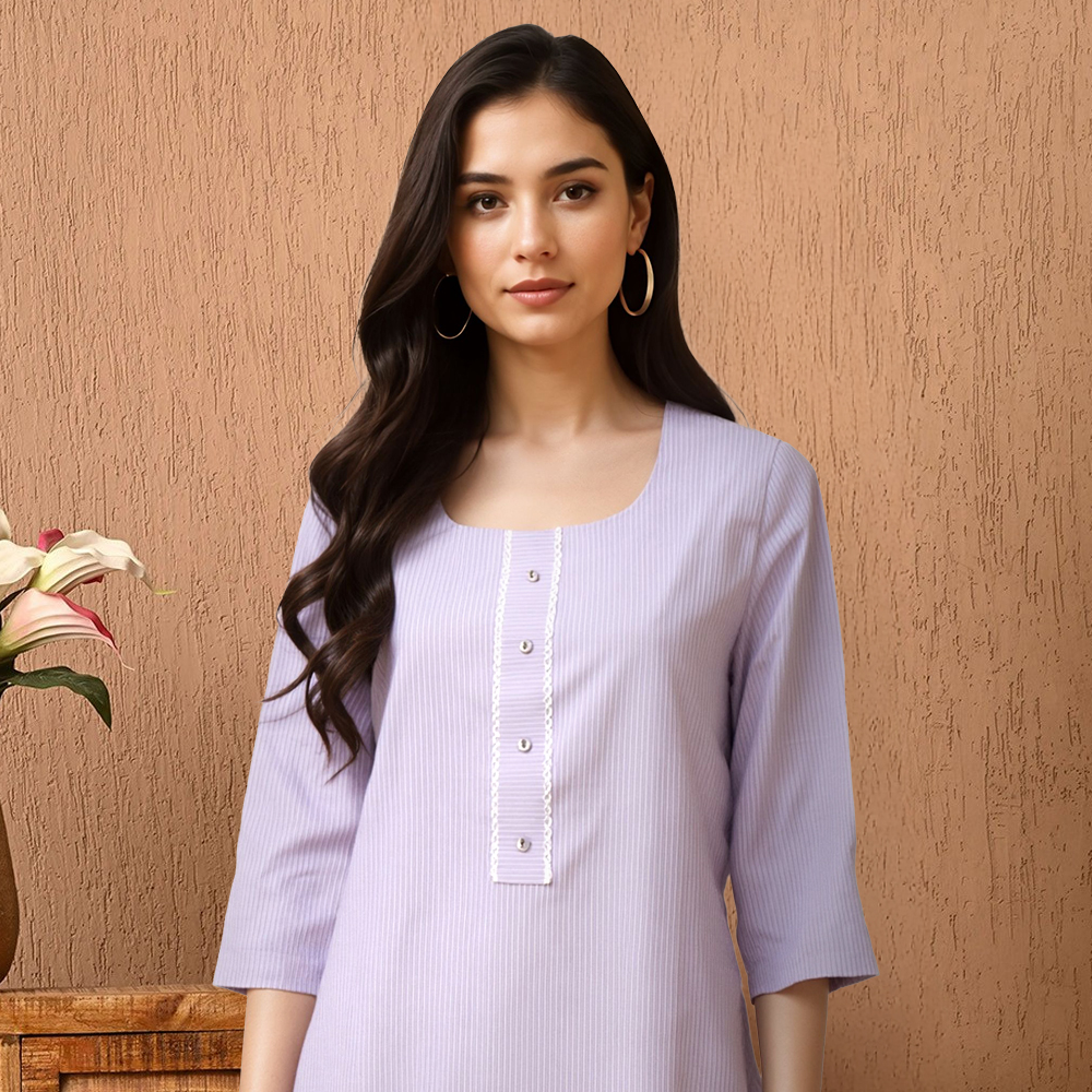 A subtle lace-trimmed button placket adds a touch of femininity to the structured silhouette—making this kurta your go-to for effortless sophistication.