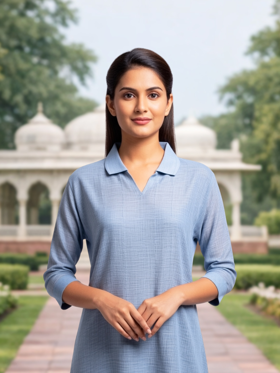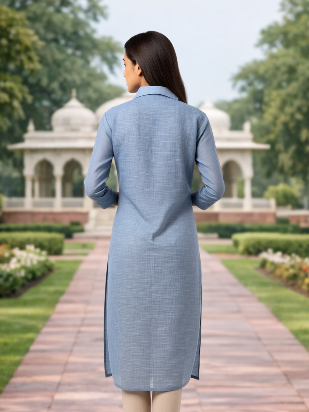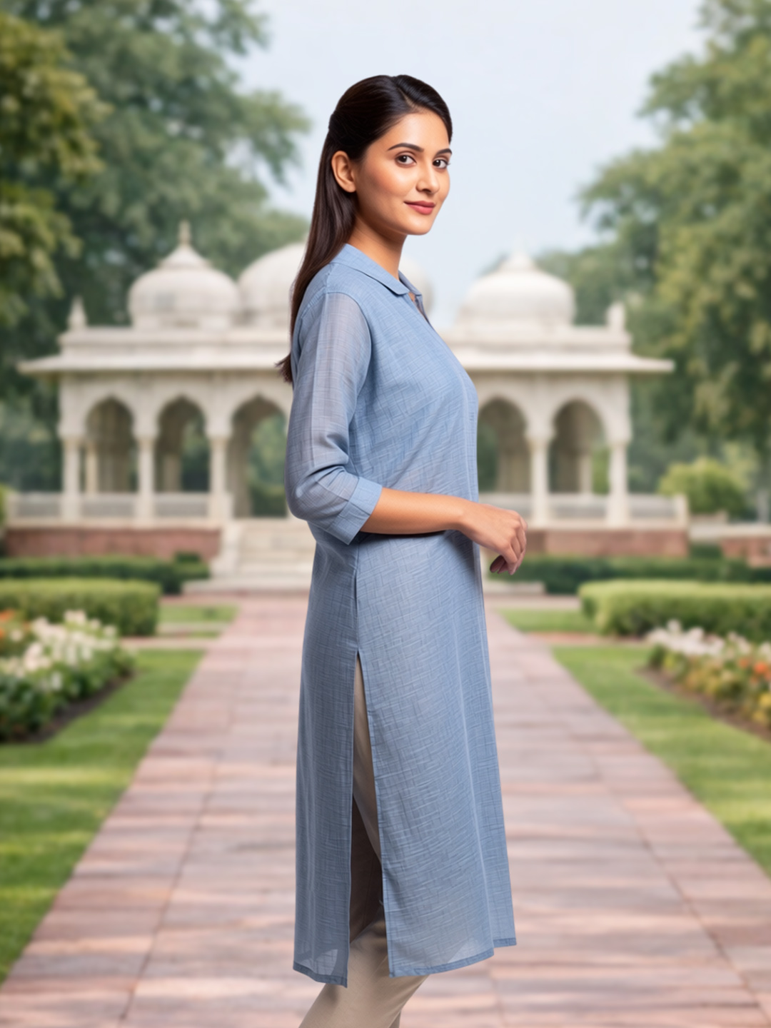 Step into sophistication with this Modern Collar Neckline Straight-Cut Kurta, designed for the contemporary woman. Crafted from breathable fabric, it ensures comfort while keeping you stylish all day long. The three-quarter sleeves add a touch of grace, making it perfect for office wear, casual outings, or festive gatherings.