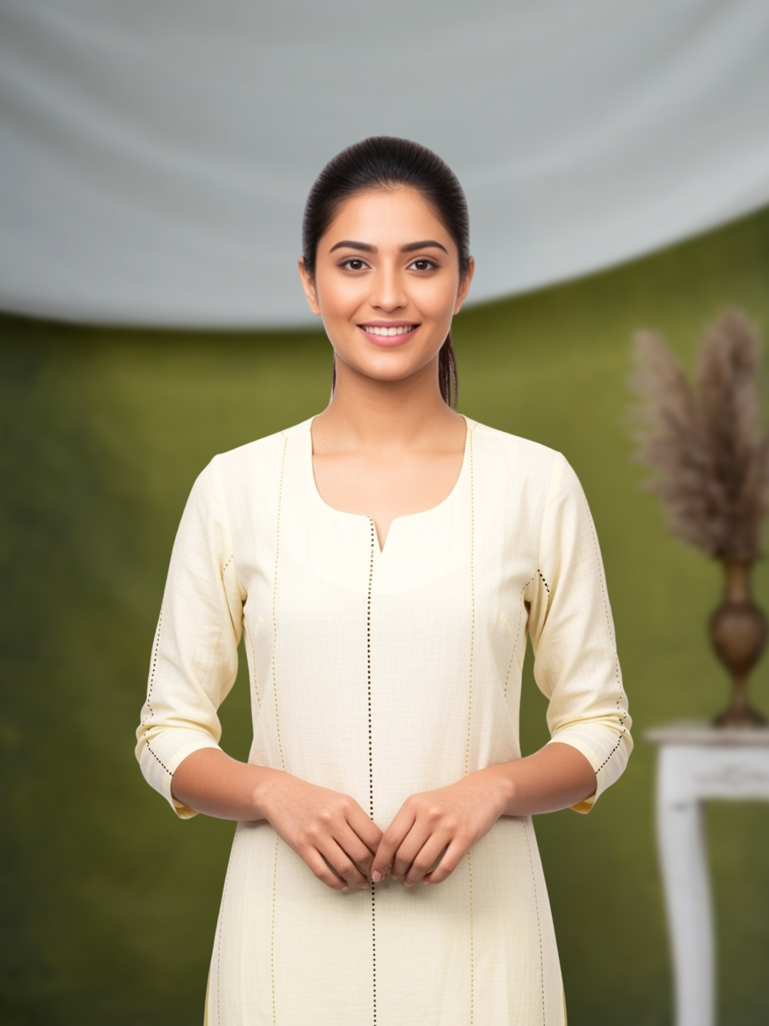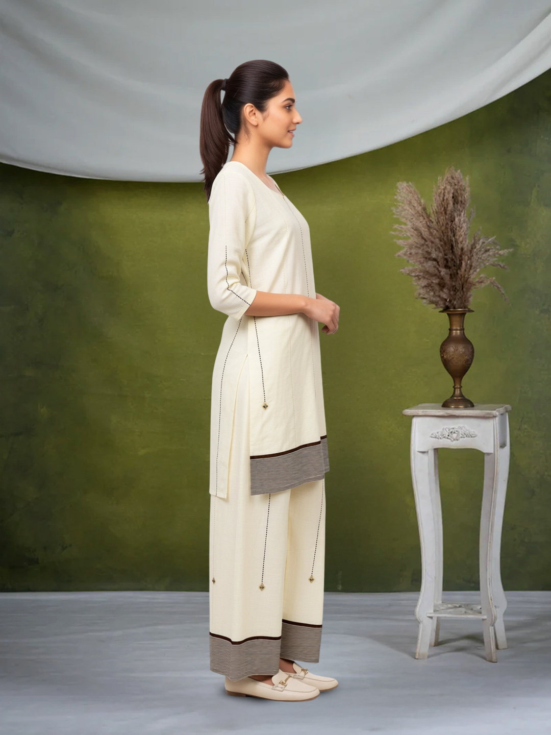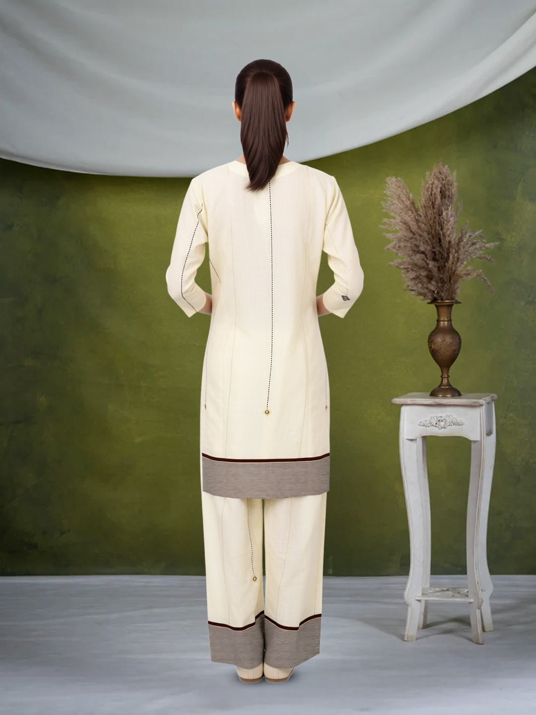 Designed for modern women who love understated sophistication, this kurta and palazzo set features subtle stitch detailing and a round neckline with a delicate notch. The breathable fabric and comfortable fit make it ideal for long hours, while the coordinated wide-leg palazzo pants complete a polished, contemporary look.