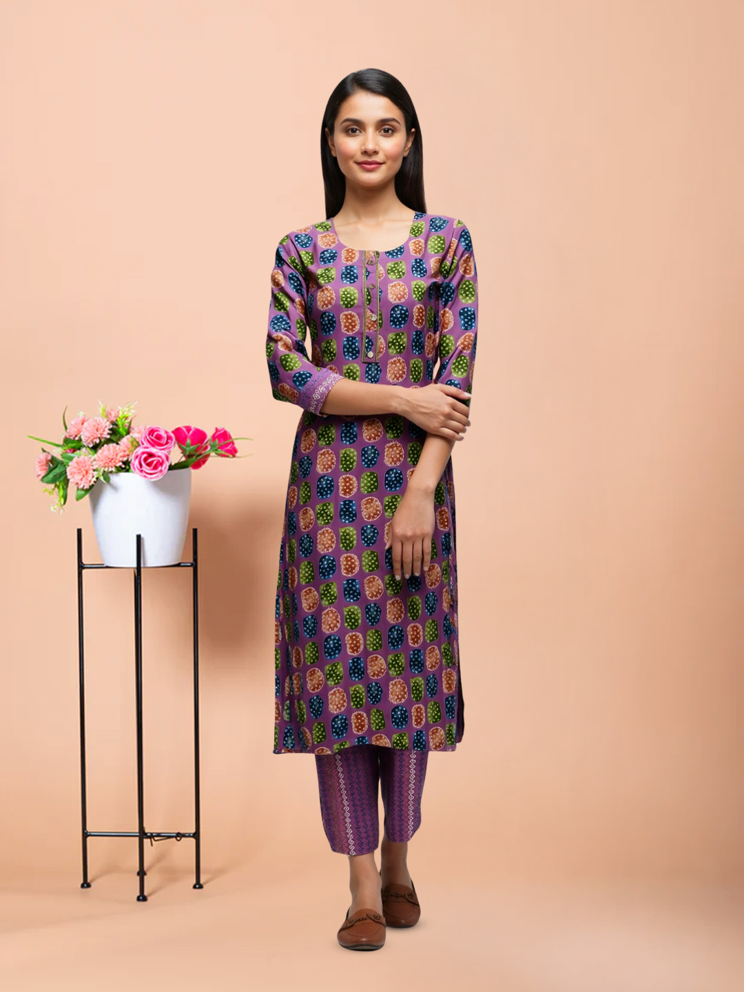 Brighten up your day with this fun and contemporary salwar suit set. The multicolor geometric print of squares and circles brings a modern edge, while the round neckline with tie-up detailing keeps it rooted in tradition. The three-quarter sleeves with matching print details and relaxed straight-fit pants offer comfort without compromising on style. A contrasting magenta dupatta with fringed edges adds a final pop of color to this striking outfit.