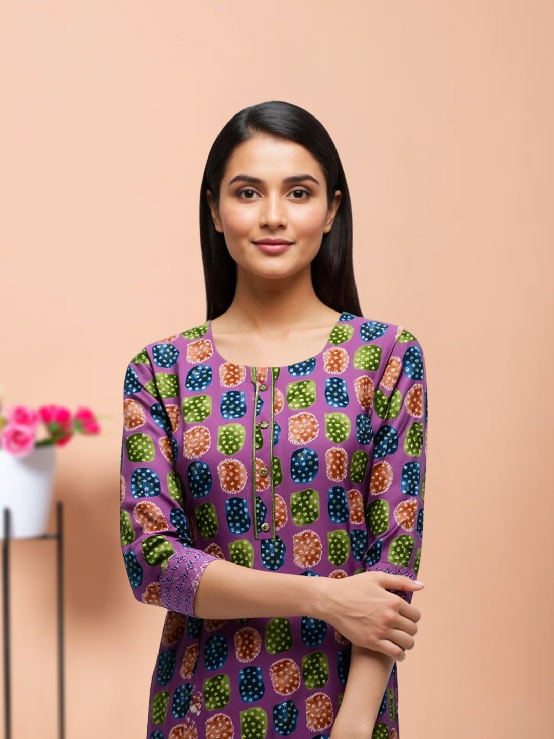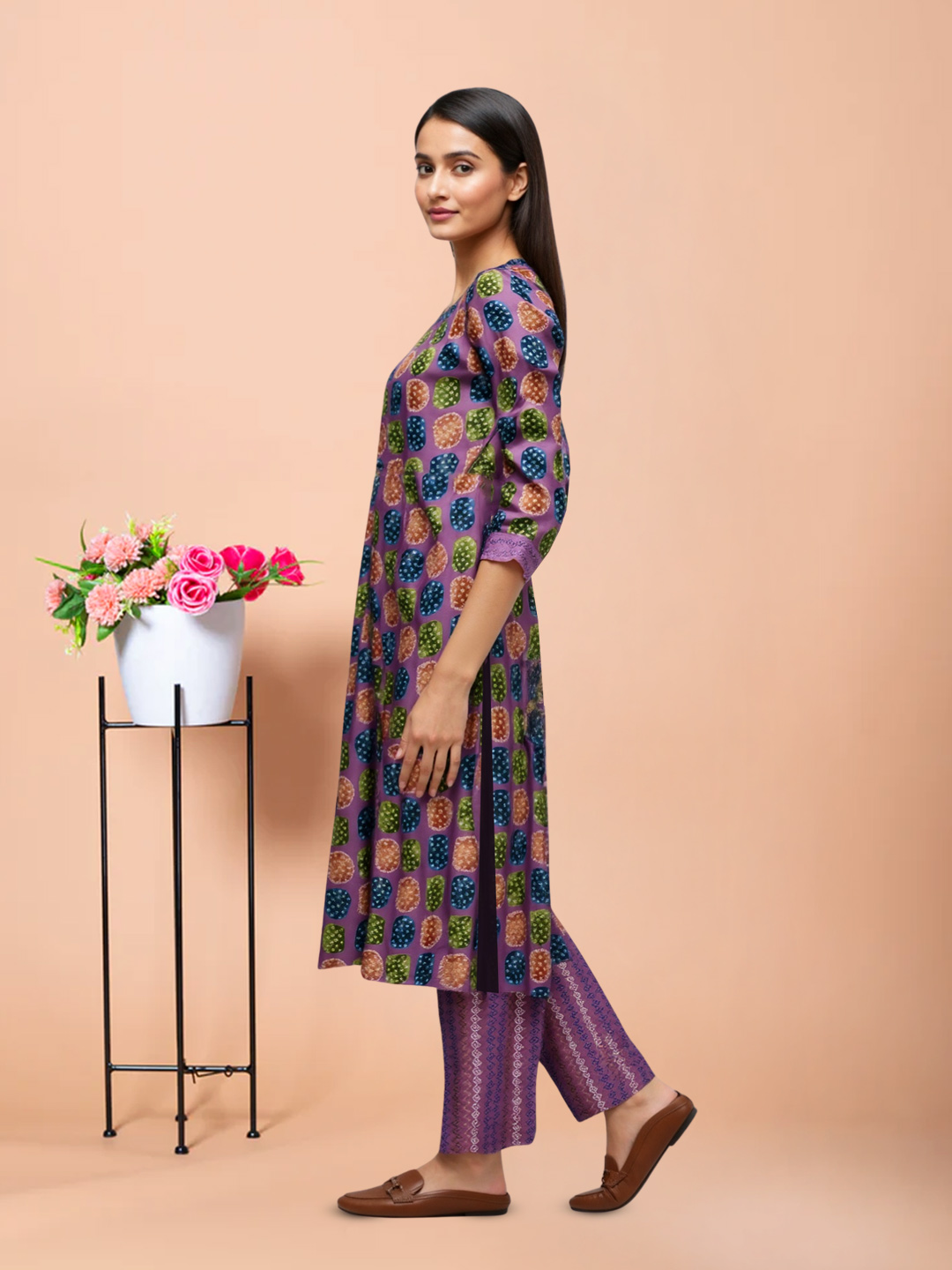 Bold, bright, and beautiful—this multicolor geometric printed salwar suit set has it all. The kurta’s colorful prints are complemented by a traditional round neckline with a tie-up detail, while the three-quarter sleeves add just the right amount of coverage. The relaxed straight-cut fit and matching printed pants keep you comfortable, and the magenta dupatta with fringed edges adds a lively contrast that pulls the whole look together.