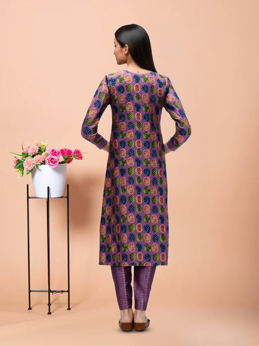 Inject a burst of color into your wardrobe with this multicolor geometric printed salwar suit set. Featuring a lively mix of square and circular prints, the traditional round neck with a tie-up detail adds a touch of classic charm. The three-quarter sleeves with matching print details, paired with comfortable straight-cut pants, make this set perfect for both casual and festive occasions. The contrasting magenta dupatta with fringed edges completes the playful yet elegant look.