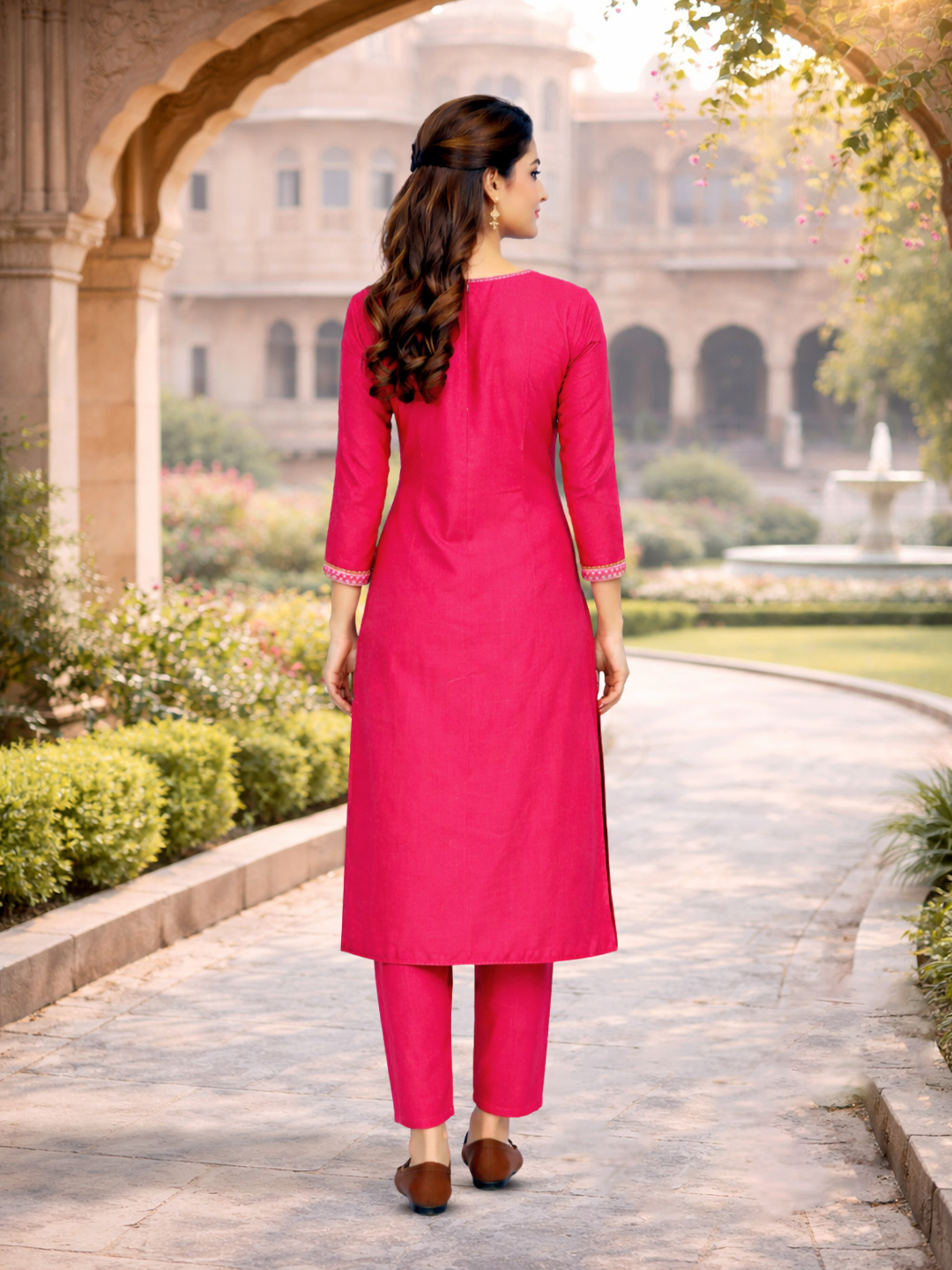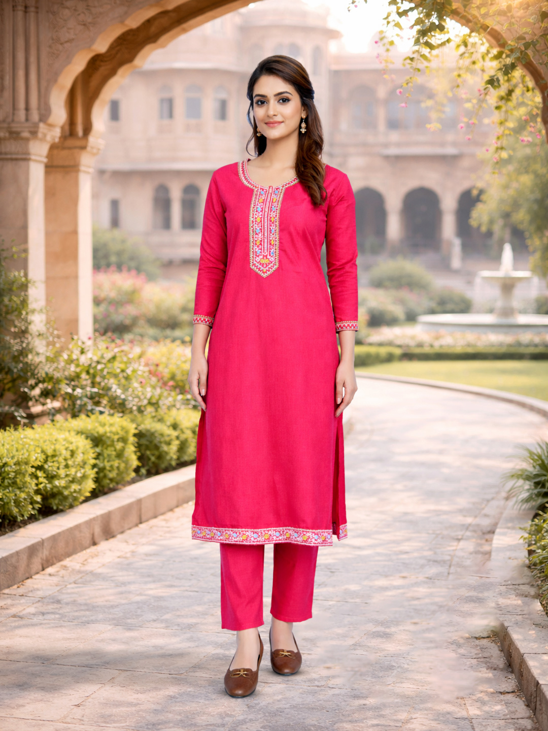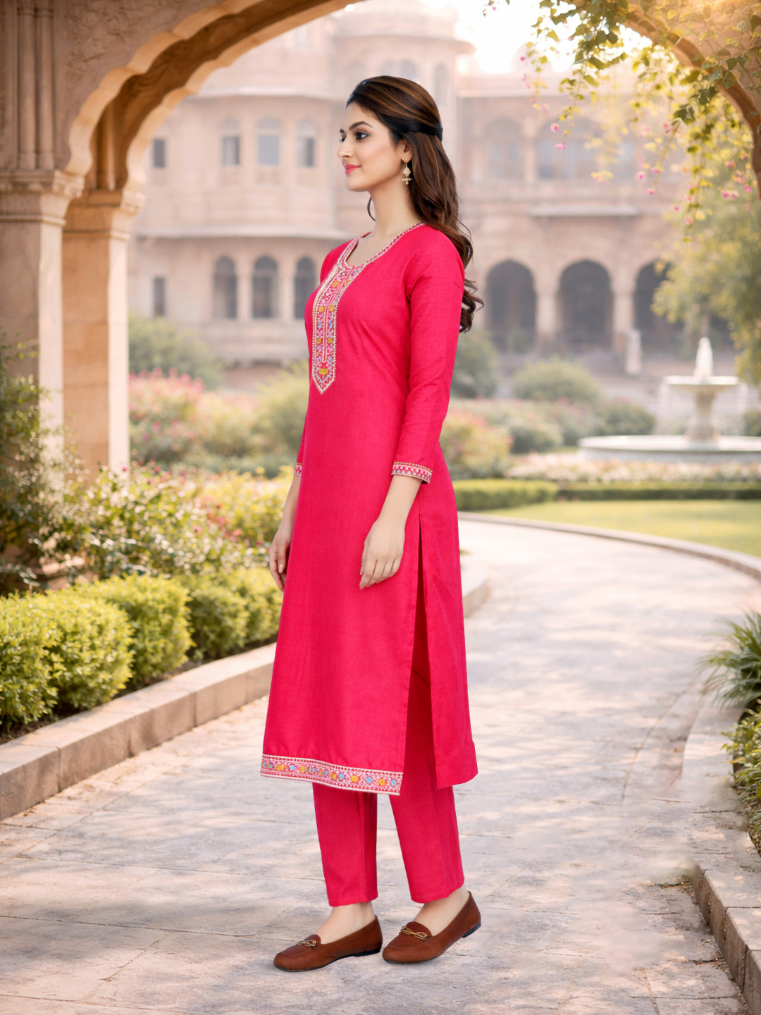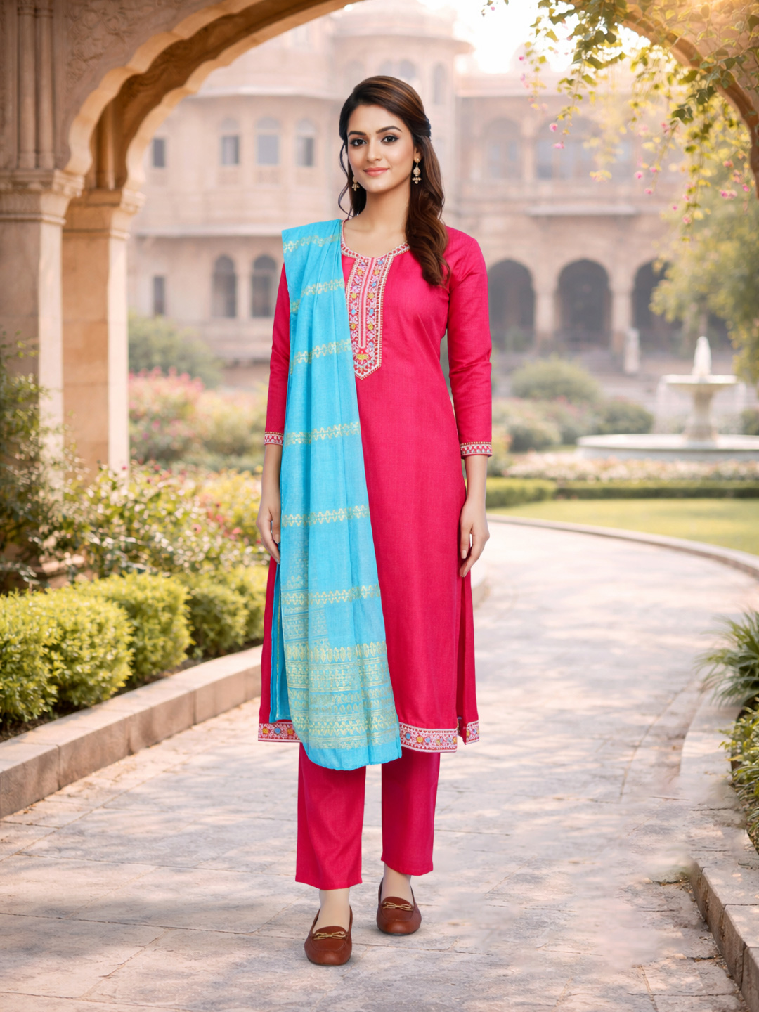 Step out in confidence with this thoughtfully designed ethnic suit set. The multicolor embroidery on the neckline and cuffs adds a unique artistic flair, while the straight-fit silhouette keeps the look clean and modern. The airy dupatta, detailed with soft stripes and a refined border, enhances the outfit’s overall sophistication. Ideal for both casual outings and festive gatherings.
