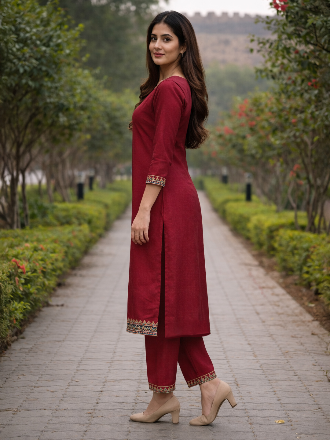 | Pant Type | Matching churidar pants with coordinated embroidery |