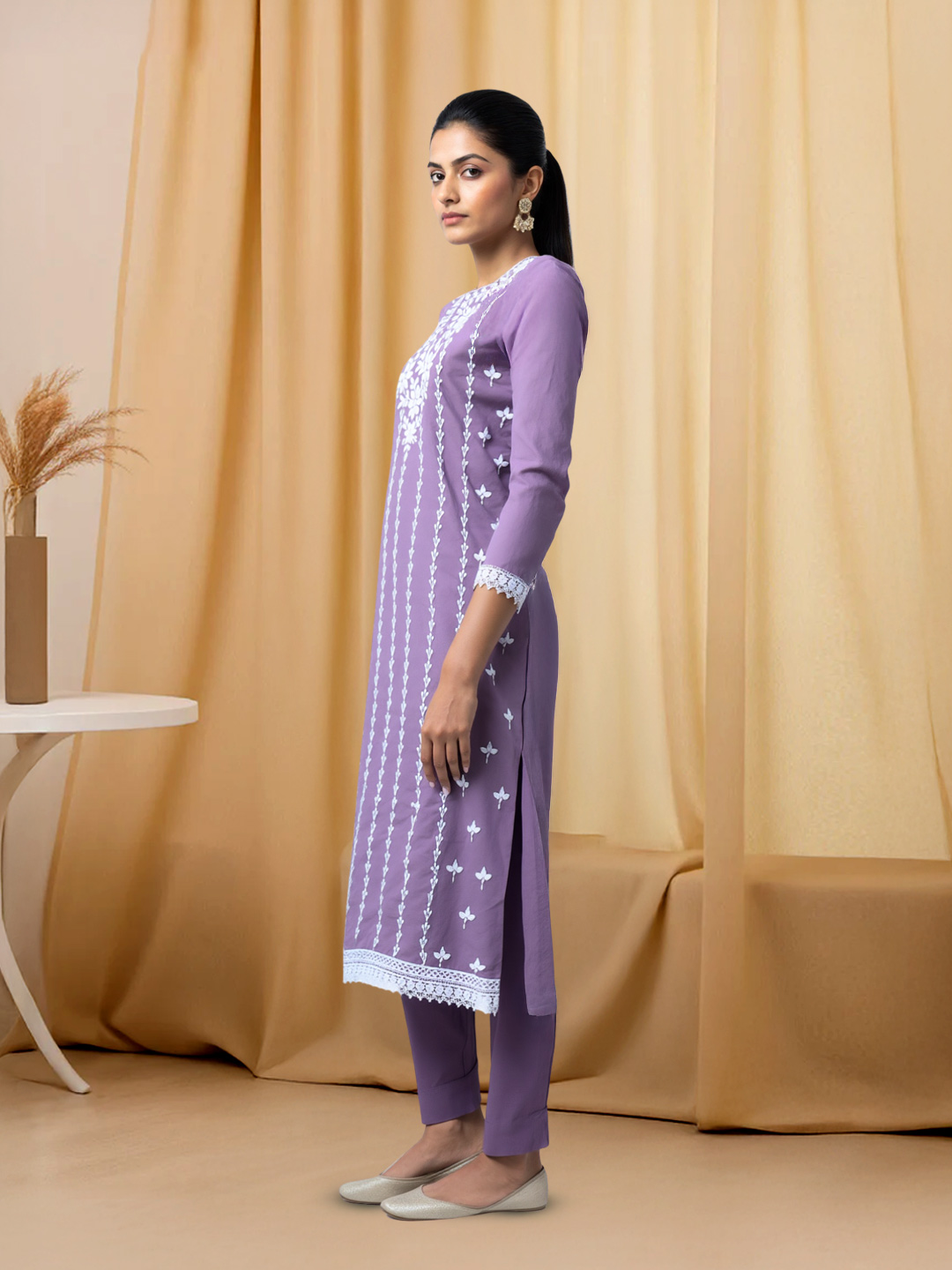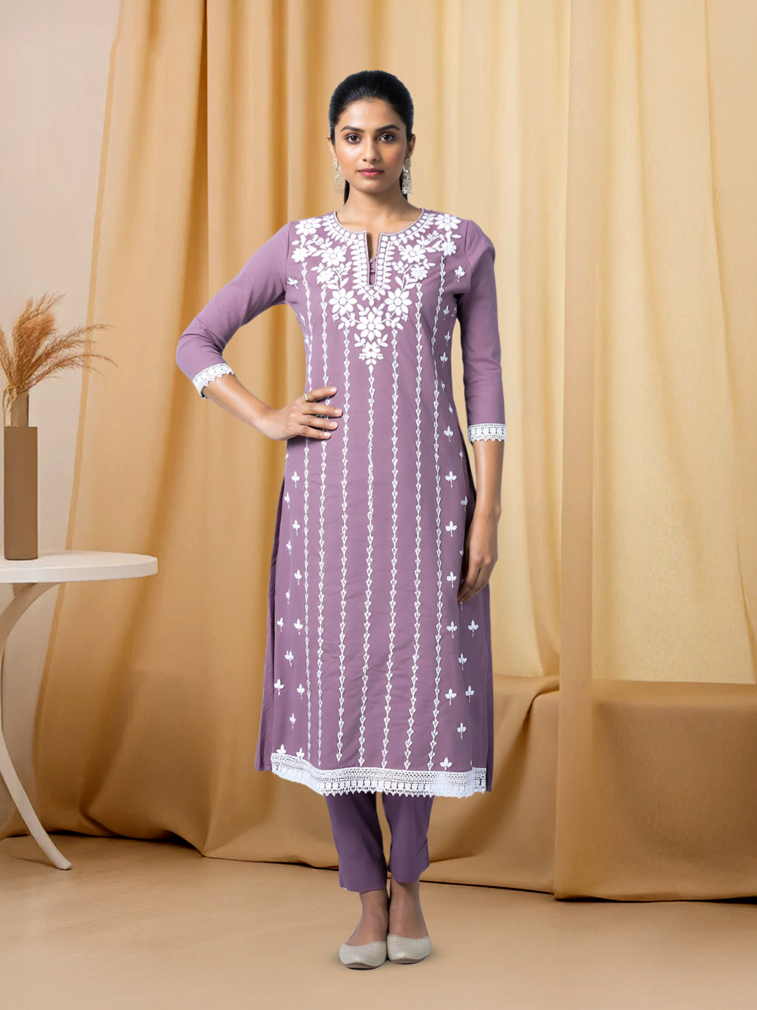 This salwar suit strikes the perfect balance between modern style and ethnic grace. The notched neckline paired with rich floral embroidery gives a sophisticated appeal. Crafted from premium-quality fabric, the set is completed with a matching bottom and an elegant coordinated dupatta.