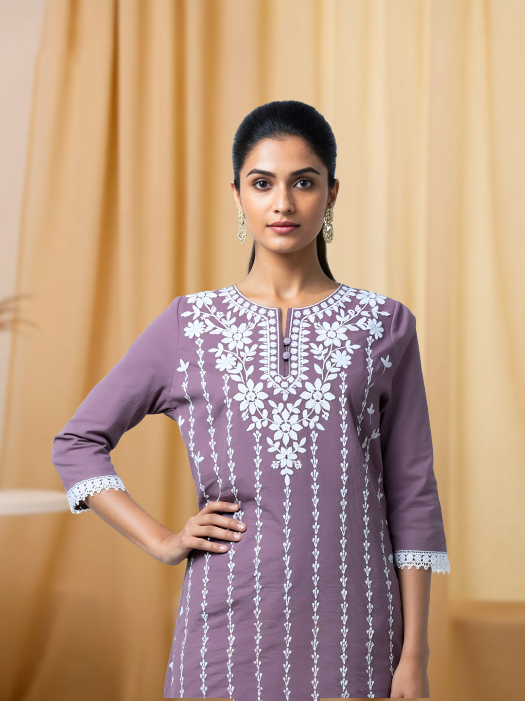 Stylish Notched Neck Ensemble with Heavy Floral Detailing