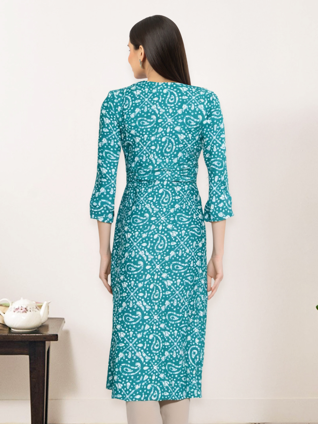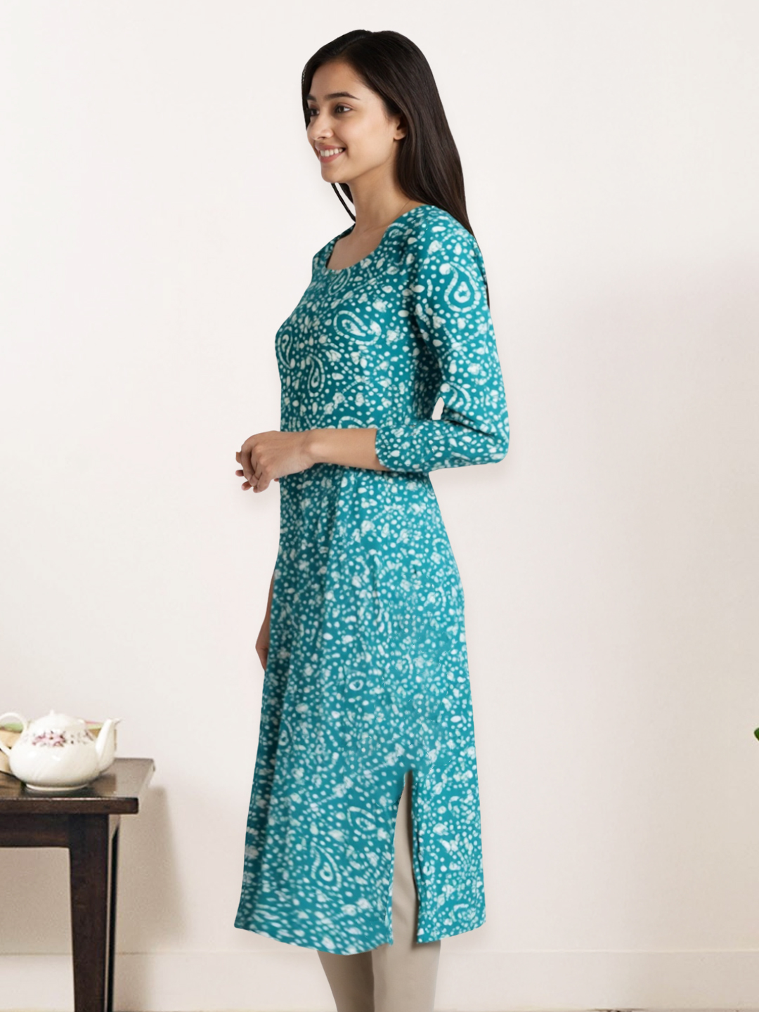 This paisley print kurta offers a graceful silhouette with its straight-cut design and soft premium fabric. The round neckline and 3/4 sleeves ensure a flattering and comfortable fit, making it an ideal choice for workdays, casual meet-ups, or family gatherings.