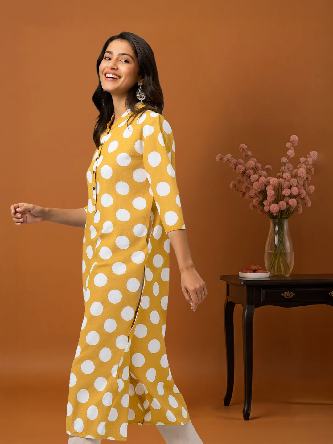 Featuring a smart mandarin collar and a straight silhouette, this polka dot kurta is your go-to for easy elegance. Whether you're headed to the office or catching up with friends, the classic dots and sleek neckline create a balanced look of grace and charm.