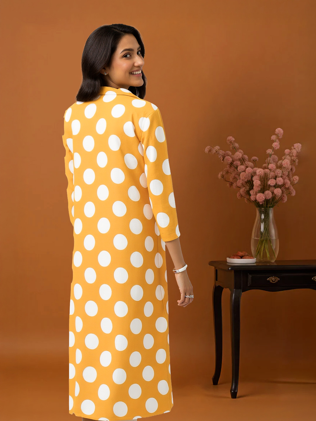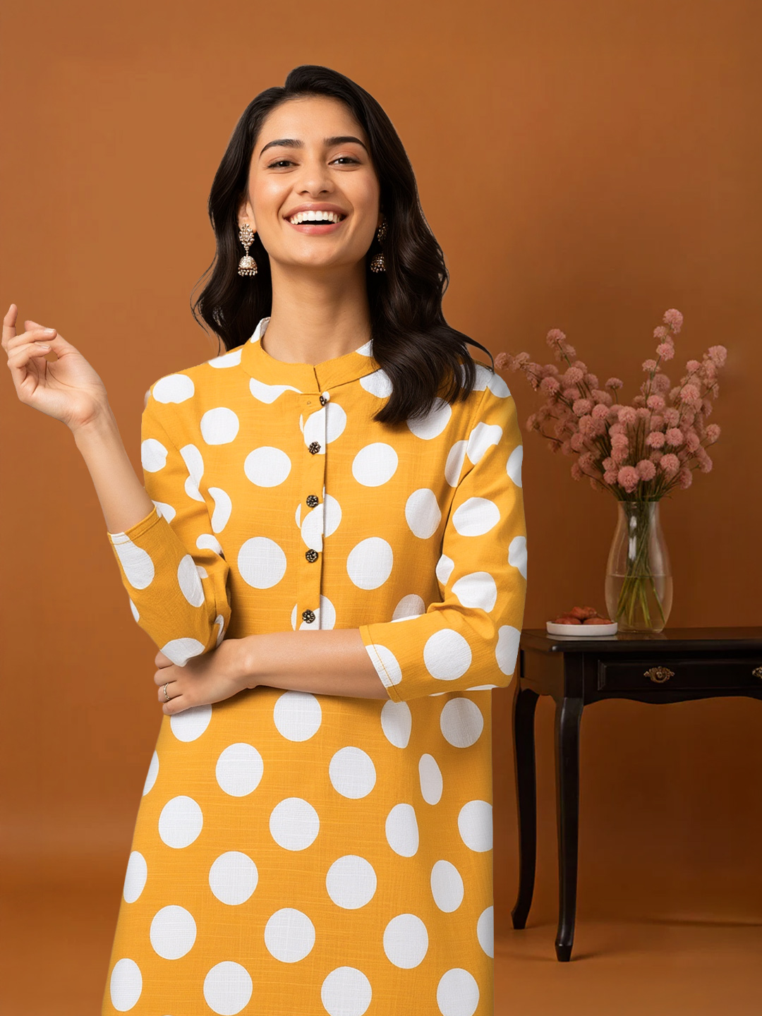 Step into timeless style with this Polka Dot Straight Kurta featuring a smart mandarin collar. The playful polka dot print adds a fun retro vibe, while the straight silhouette and structured neckline keep the look fresh and contemporary. Perfect for casual outings, workwear, or weekend get-togethers.