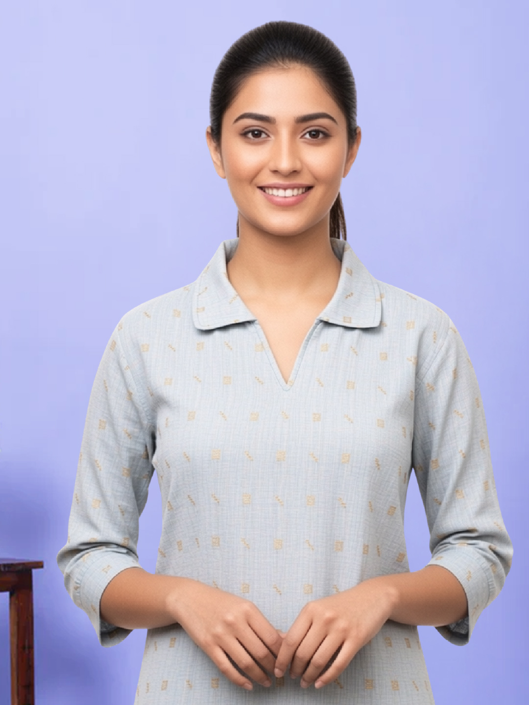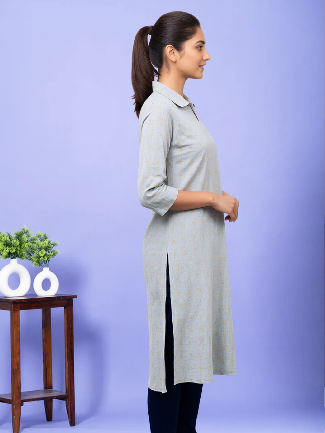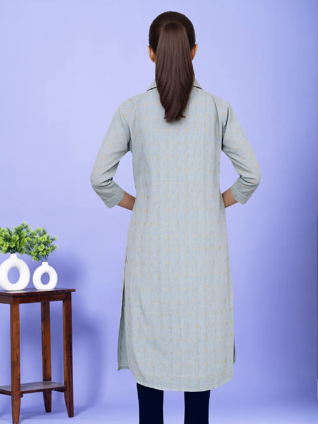 Designed for modern elegance, this straight-cut kurta features a beautifully printed collar neck and soft premium fabric. Its clean silhouette and 3/4 sleeves create a balanced look that’s stylish, breathable, and easy to wear all day long.