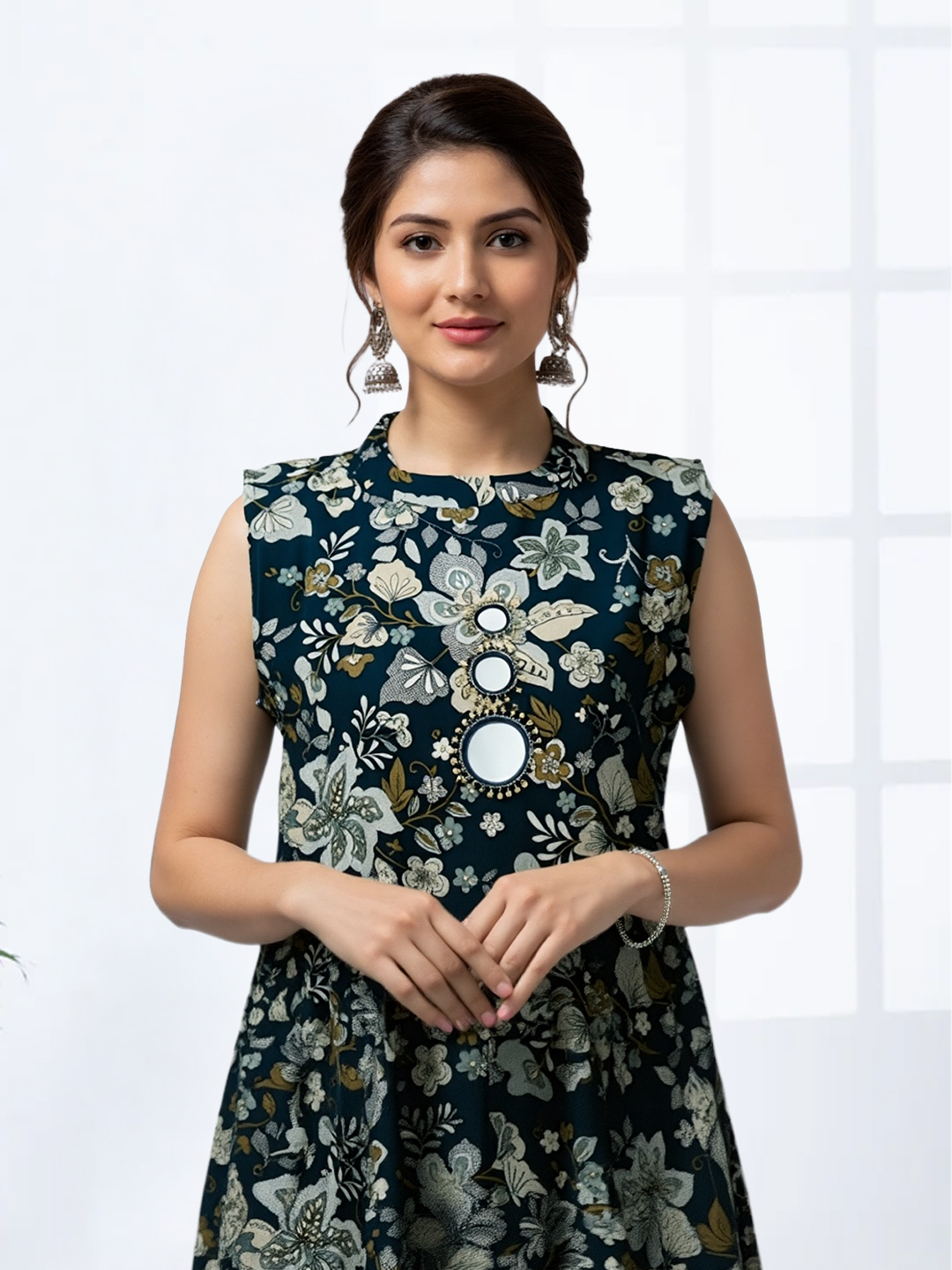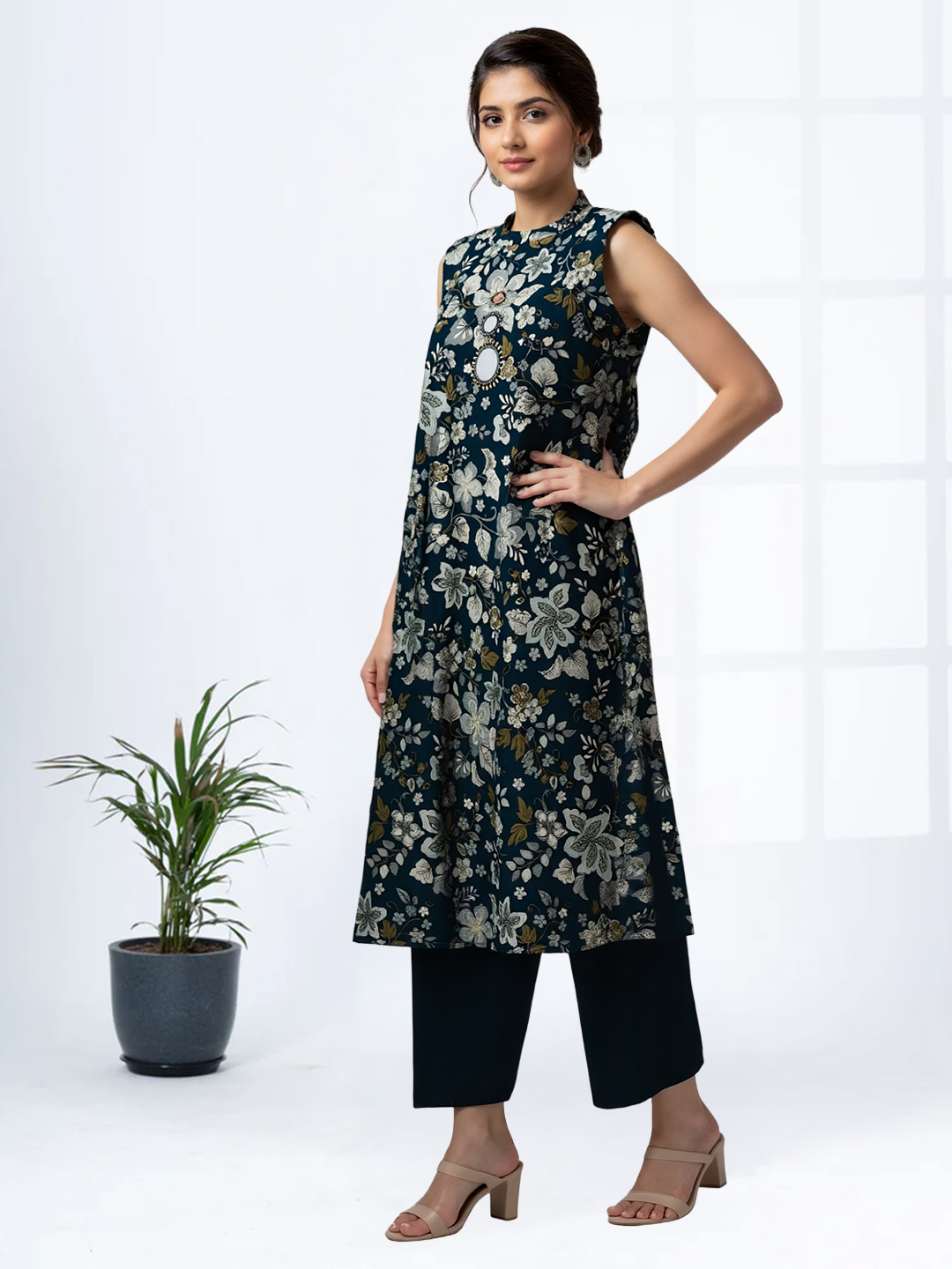 Add sparkle to your wardrobe with this exquisite printed kurta set. The shimmering mirror accents elevate the high neck design, giving you a sophisticated yet trendy appearance. Paired with a matching bottom, it delivers a complete, stylish look instantly.
