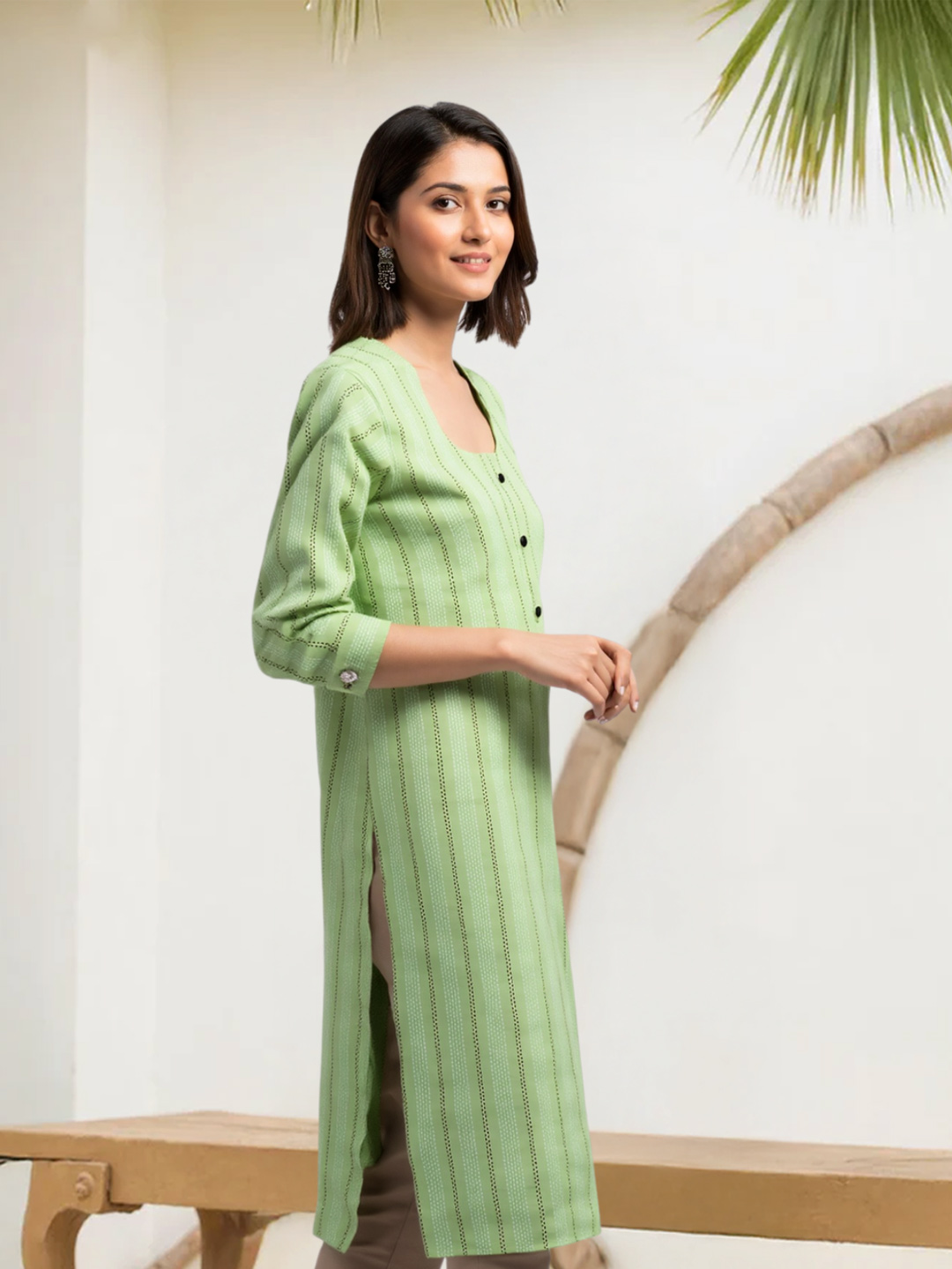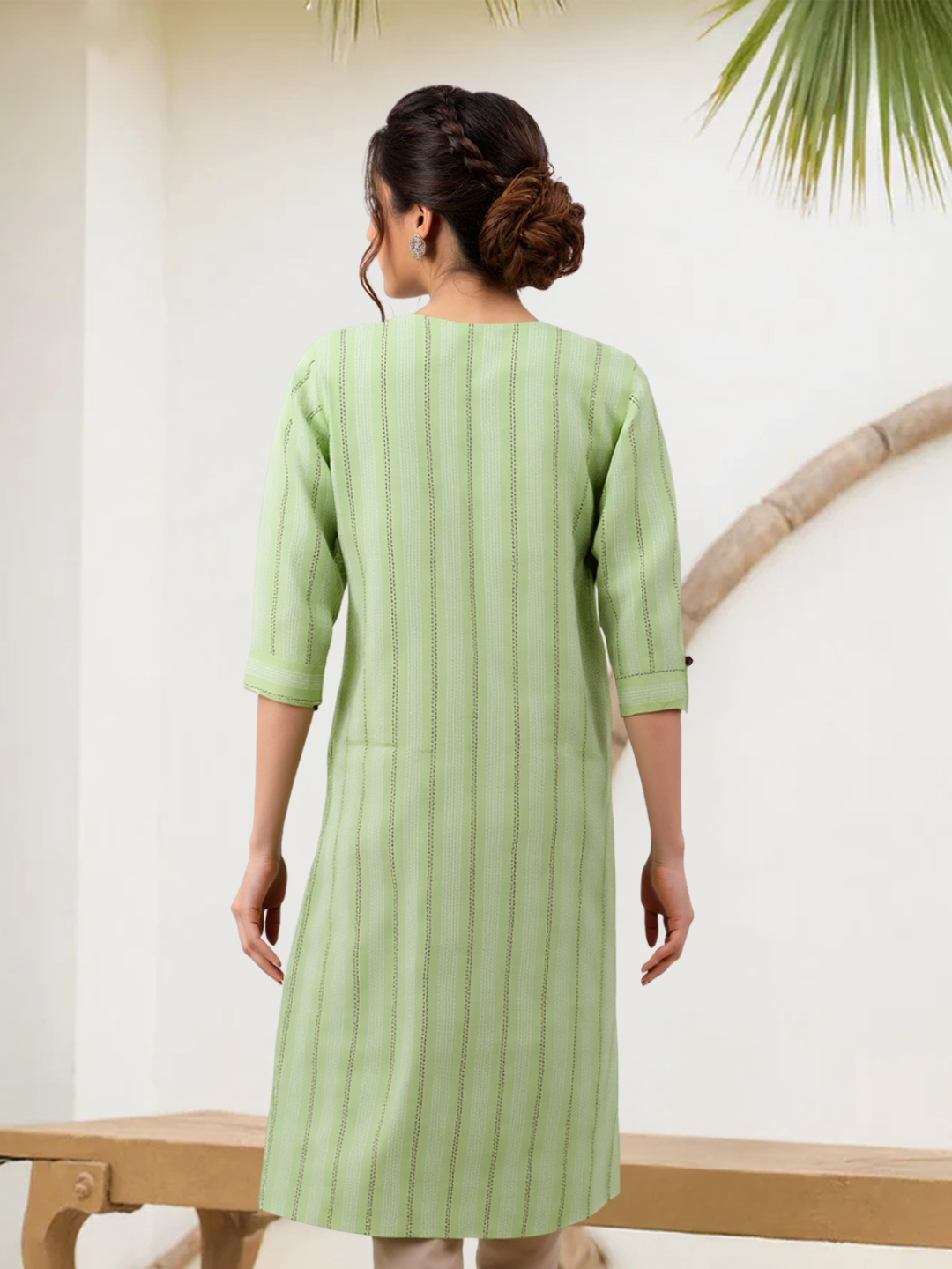 Minimal yet stylish, this straight-cut kurta is an essential wardrobe piece. The premium fabric drapes smoothly, enhancing your natural silhouette. Finished with a modest round neck and chic three-quarter sleeves, it’s the perfect blend of comfort and sophistication.