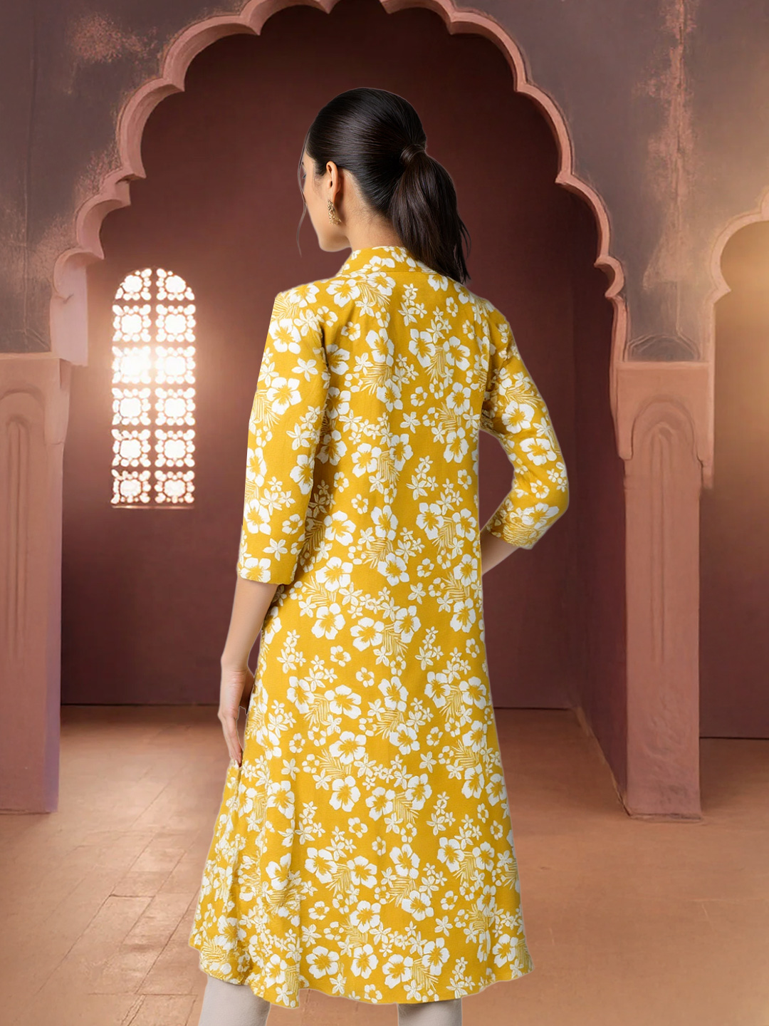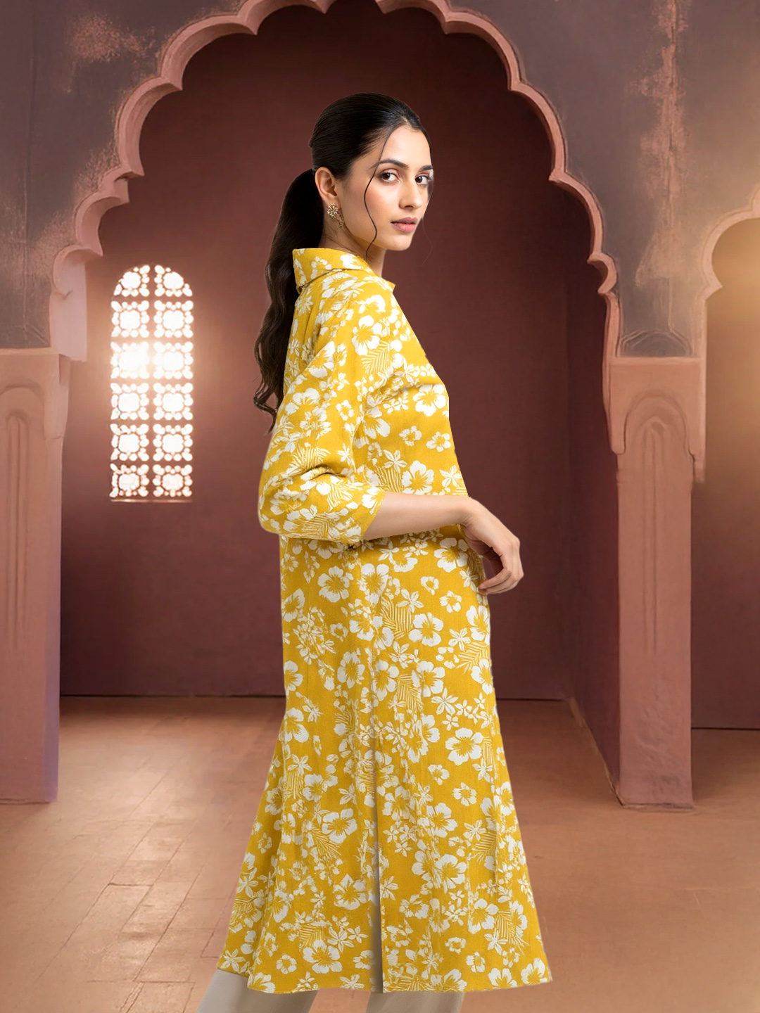 Embrace the charm of florals in full bloom with this yellow printed kurta. Made from luxurious fabric, it drapes beautifully while keeping you cool and comfortable. The radiant color enhances your natural glow, making it an ideal pick for both casual and festive occasions. Style it with statement earrings for a complete ethnic look.