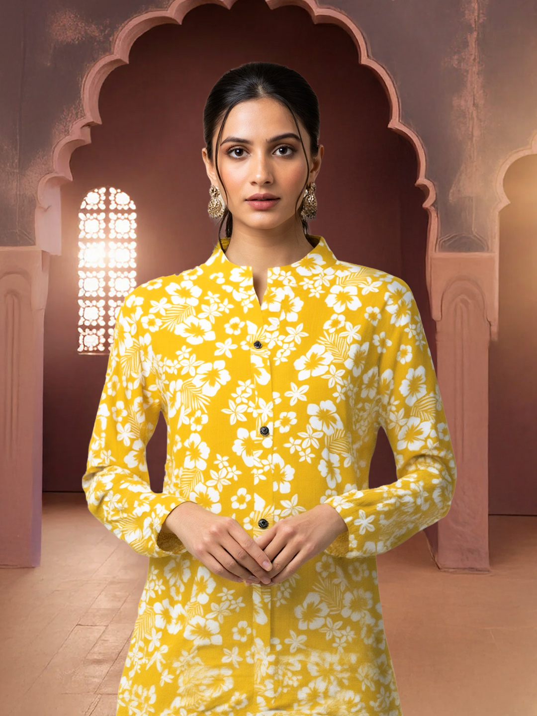 Step into the spotlight with this Radiant Yellow Floral Printed Kurta that captures the essence of joy and style. The floral patterns add a touch of femininity, while the bright yellow shade symbolizes warmth and confidence. Lightweight, breathable, and elegant — this kurta is perfect for sunny days and happy moods.