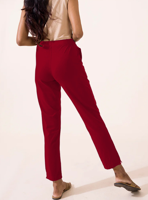 Elevate your everyday fashion with this red waist flared cigar pant, tailored to flatter your legs with a slim-fit design. The contemporary ankle-length finish and functional side pocket make it a versatile choice for modern lifestyles.