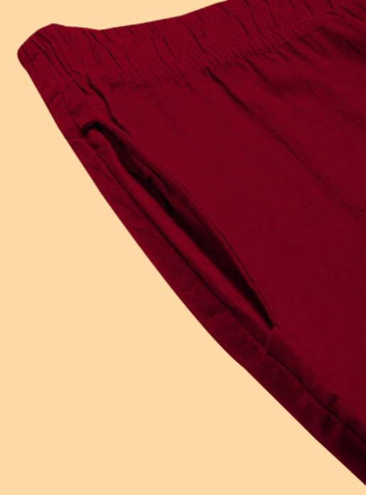 Add a touch of sophistication to your wardrobe with this red waist flared cigar pant. Featuring an elegant ribbed texture and a flattering slim-fit silhouette, it enhances your look while ensuring comfort throughout the day. The ankle-length cut and functional side pocket make it a perfect blend of style and practicality.