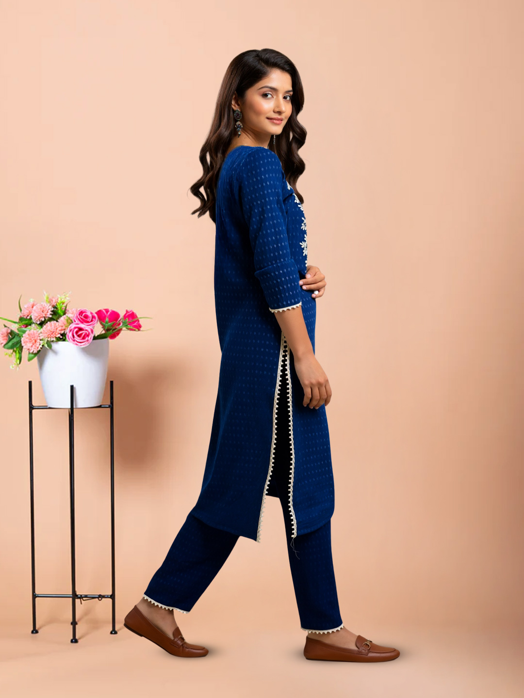 Designed for women who appreciate subtle sophistication, this straight-cut kurta features delicate floral embroidery along the round neckline. The three-quarter sleeves and comfortable fit make it a versatile choice for both casual and semi-formal occasions.