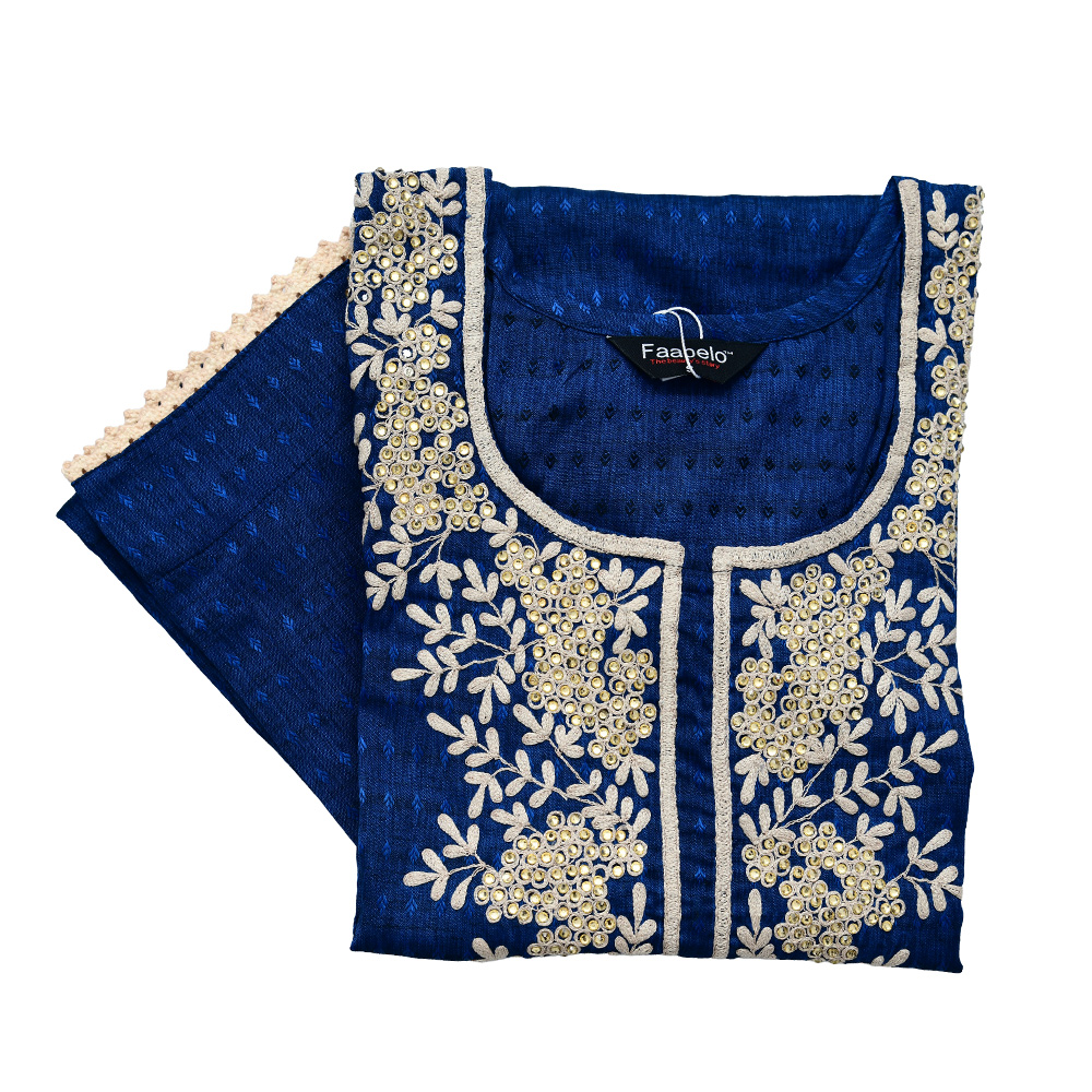 Elevate your everyday ethnic wardrobe with this straight-cut kurta set. Featuring a round neck with an embroidered panel and three-quarter sleeves, it offers a clean, polished look that pairs comfort with graceful design.