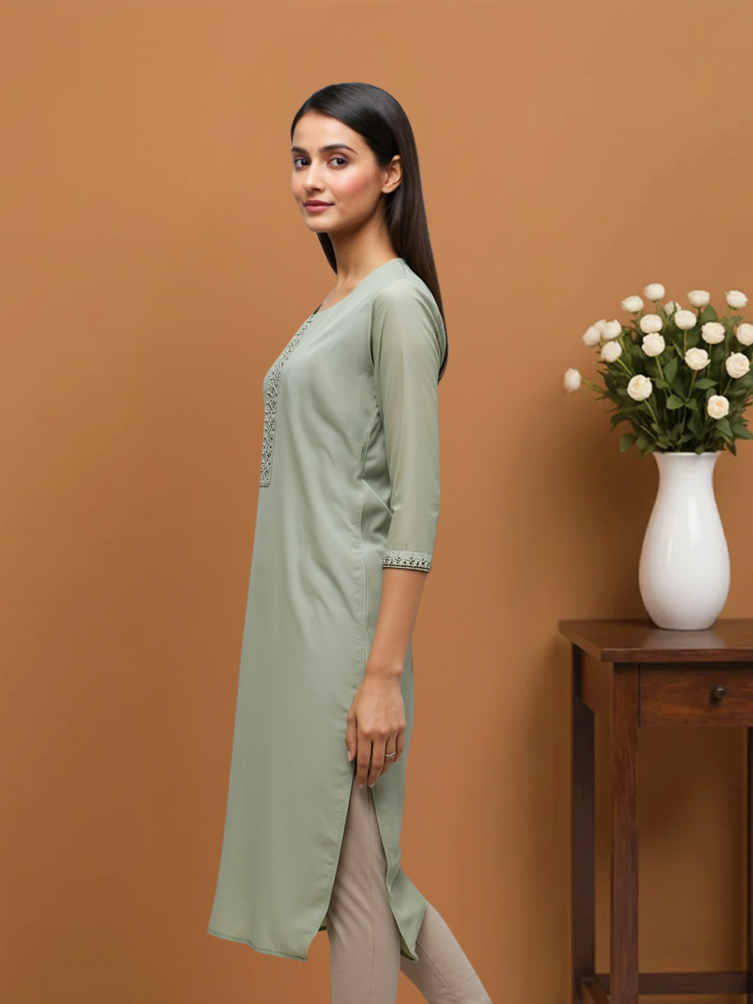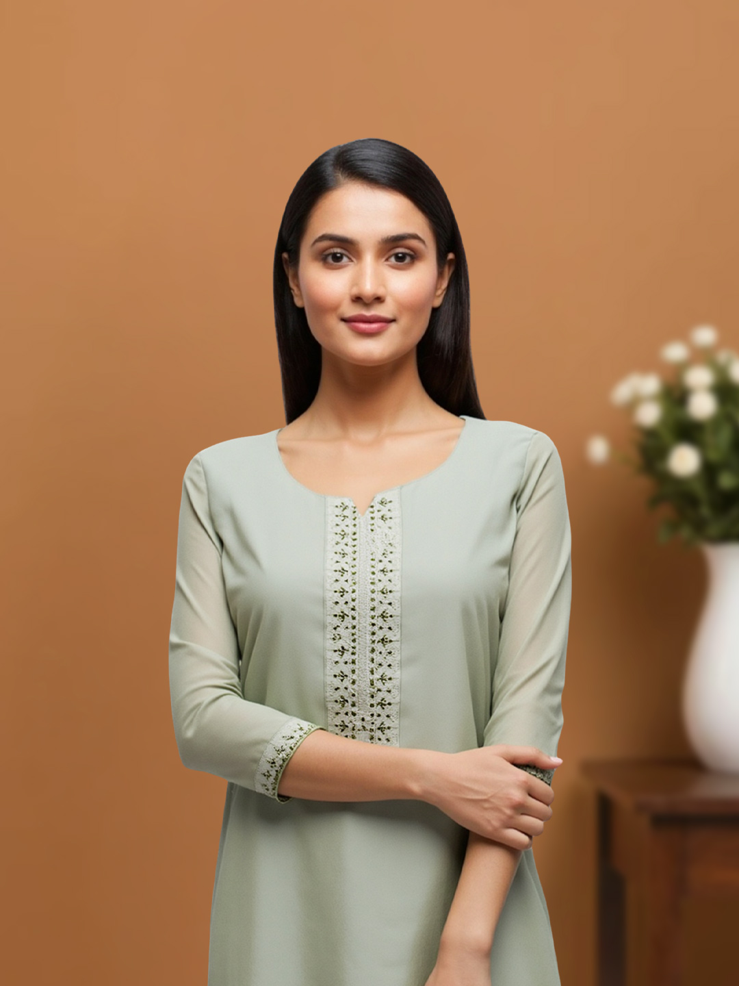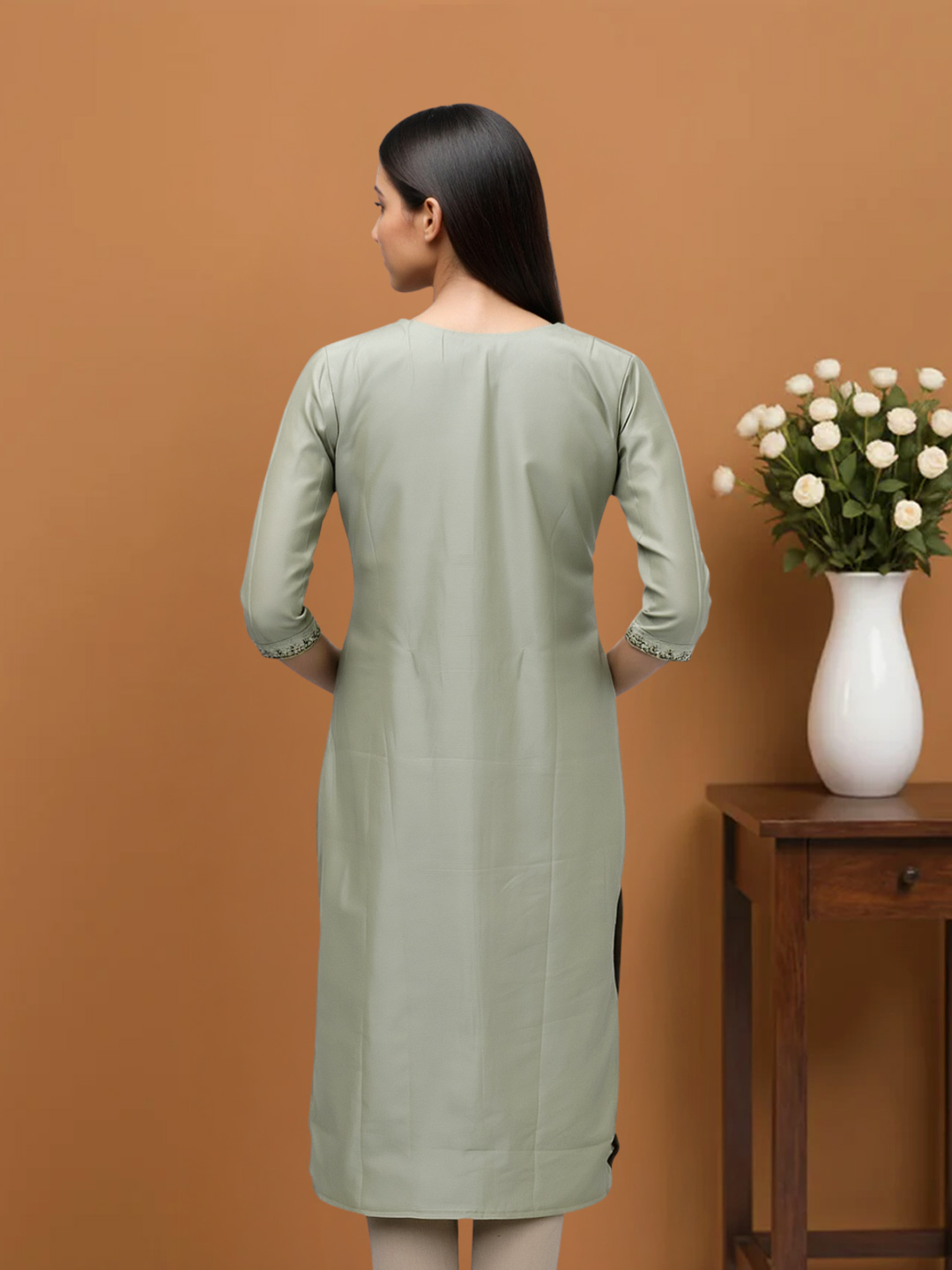 Perfect for women who appreciate simplicity with detail, this kurta combines a soft fabric feel with tasteful embroidery. The straight-fit design, round neckline, and three-quarter sleeves make it a versatile wardrobe essential.