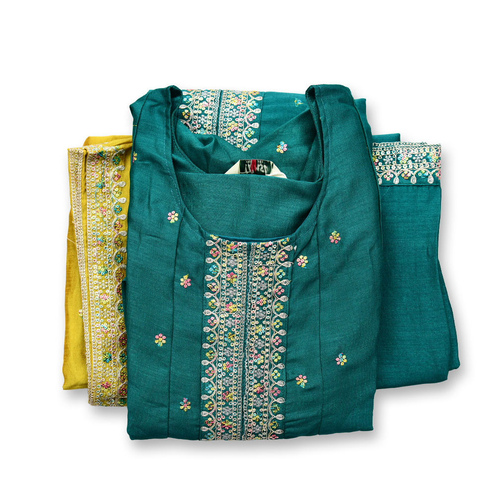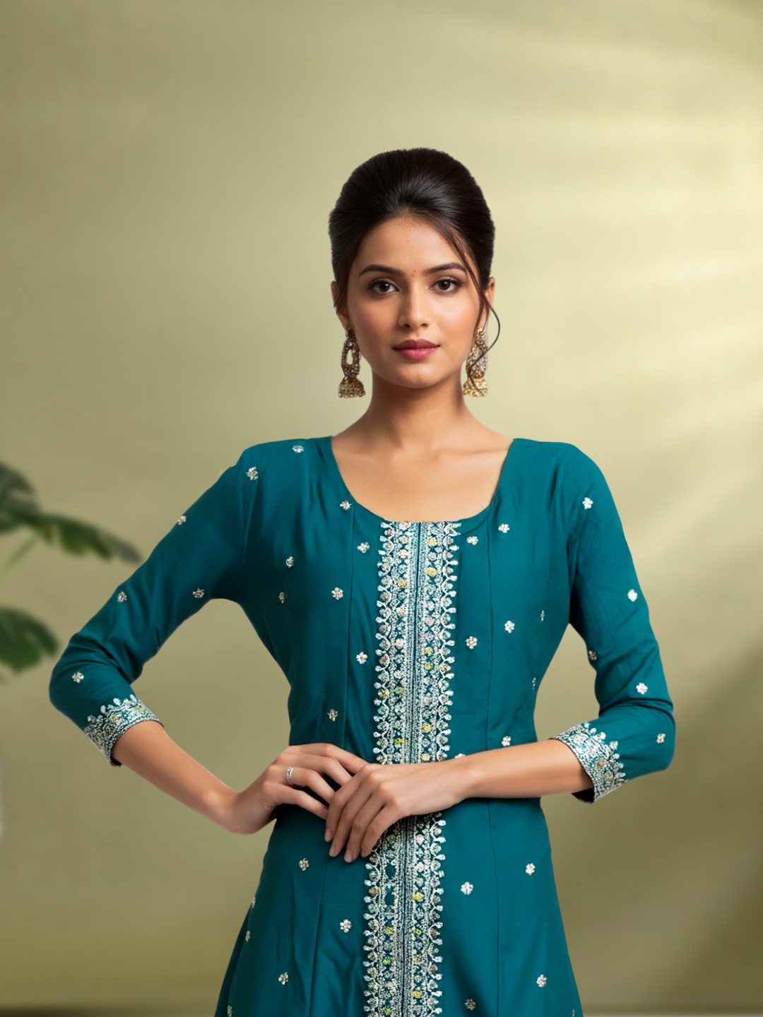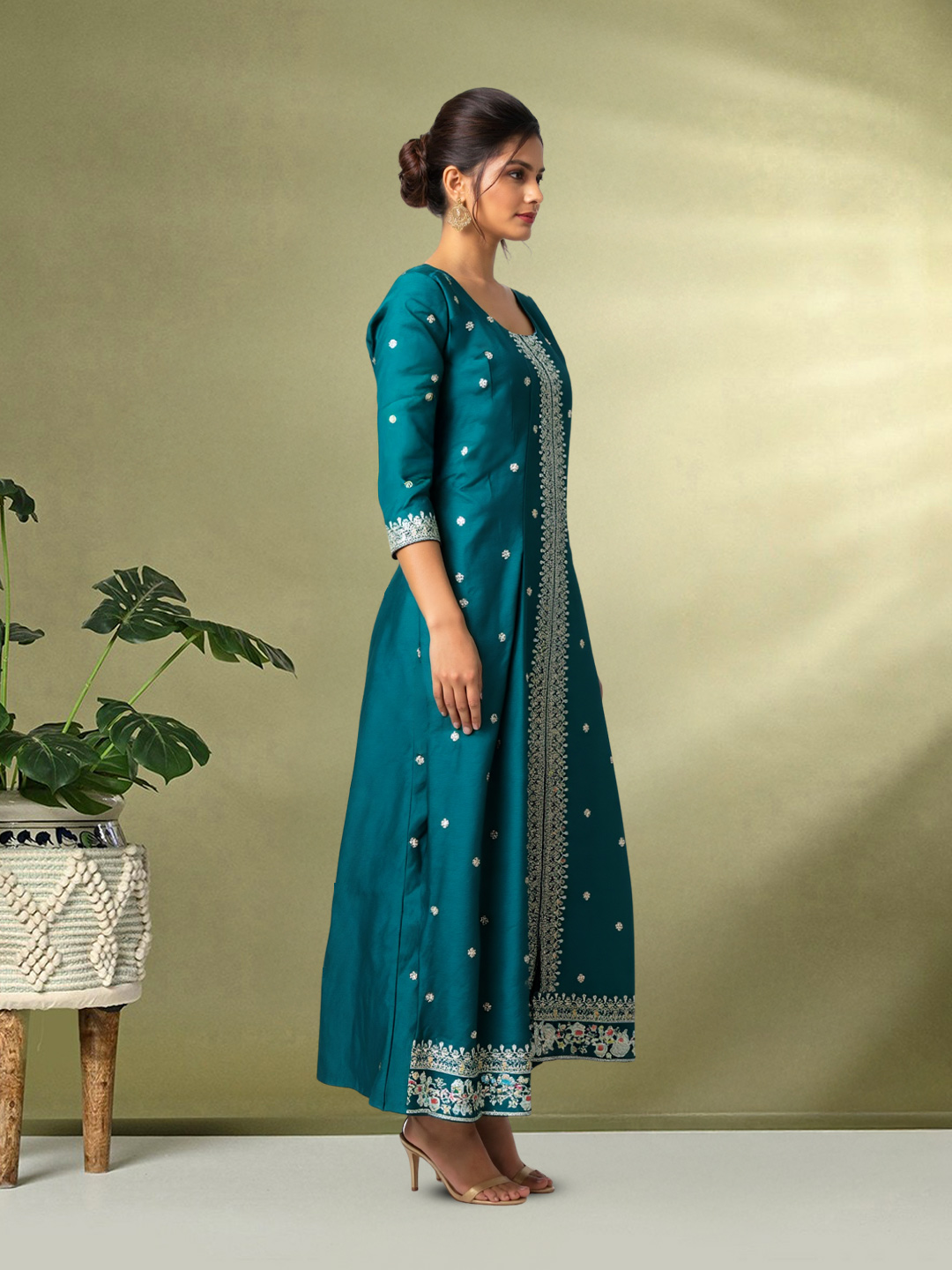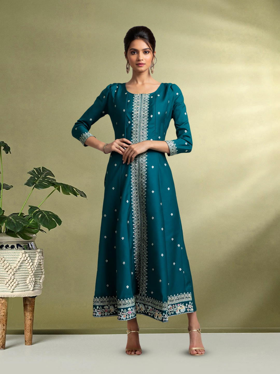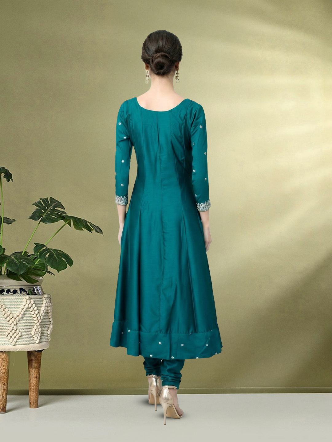 Designed to make you stand out, this Anarkali suit showcases fine floral embroidery paired with elegant detailing. The round neckline and three-quarter sleeves are beautifully adorned, striking a perfect balance between tradition and modern charm. A contrasting embroidered dupatta completes the look with sophistication.