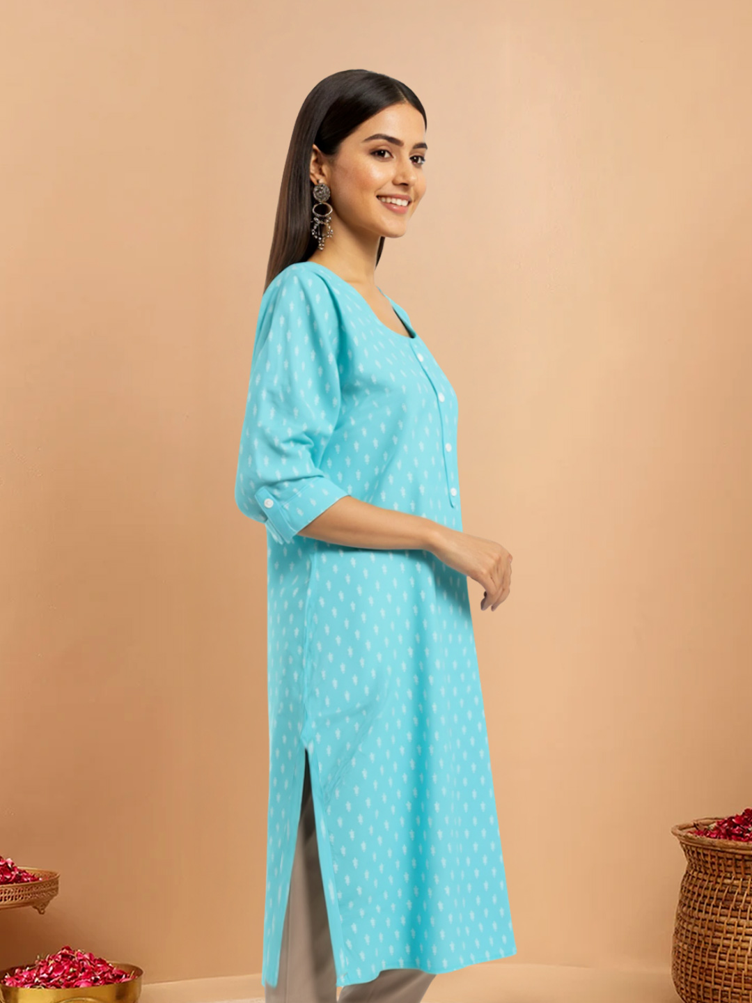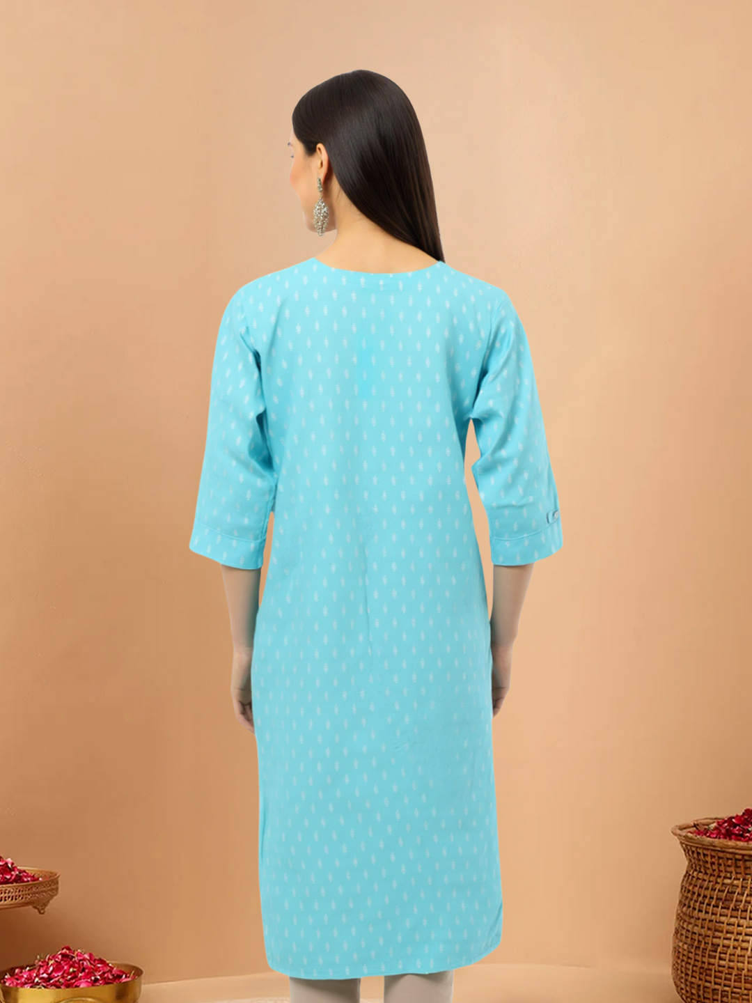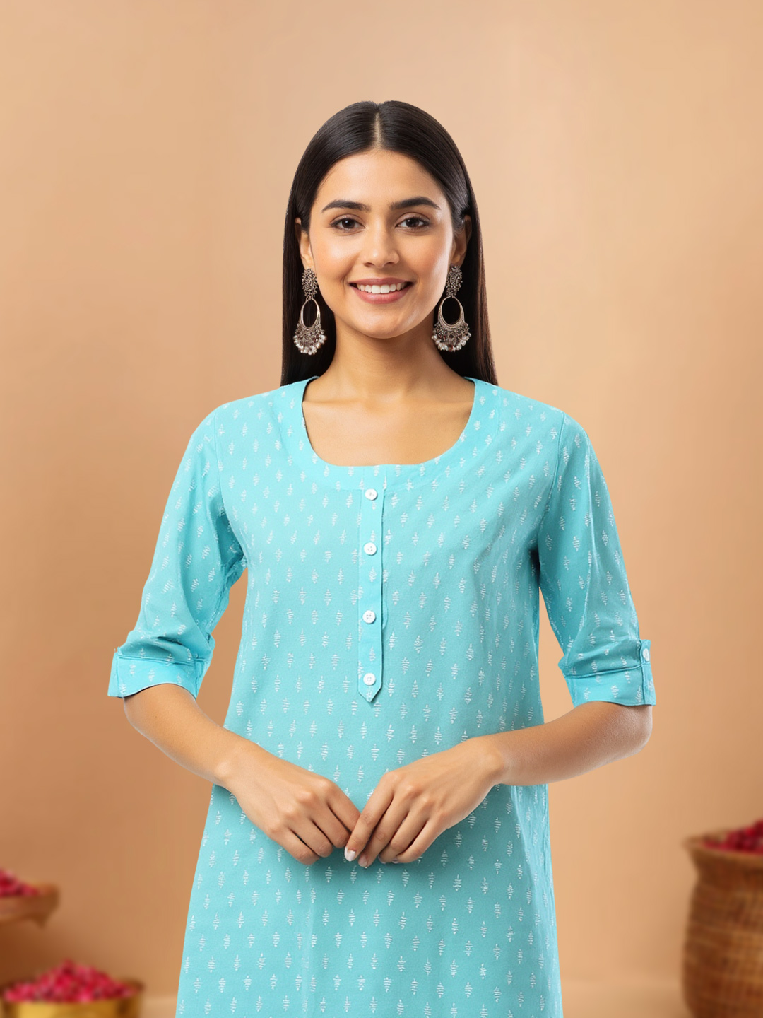 This Round Neck Printed Straight-Cut Kurta is your go-to choice for daily wear. Made from premium-quality fabric, it combines comfort and style with its classic round neckline and 3/4 sleeves—perfect for keeping you stylish and comfortable from morning to night.