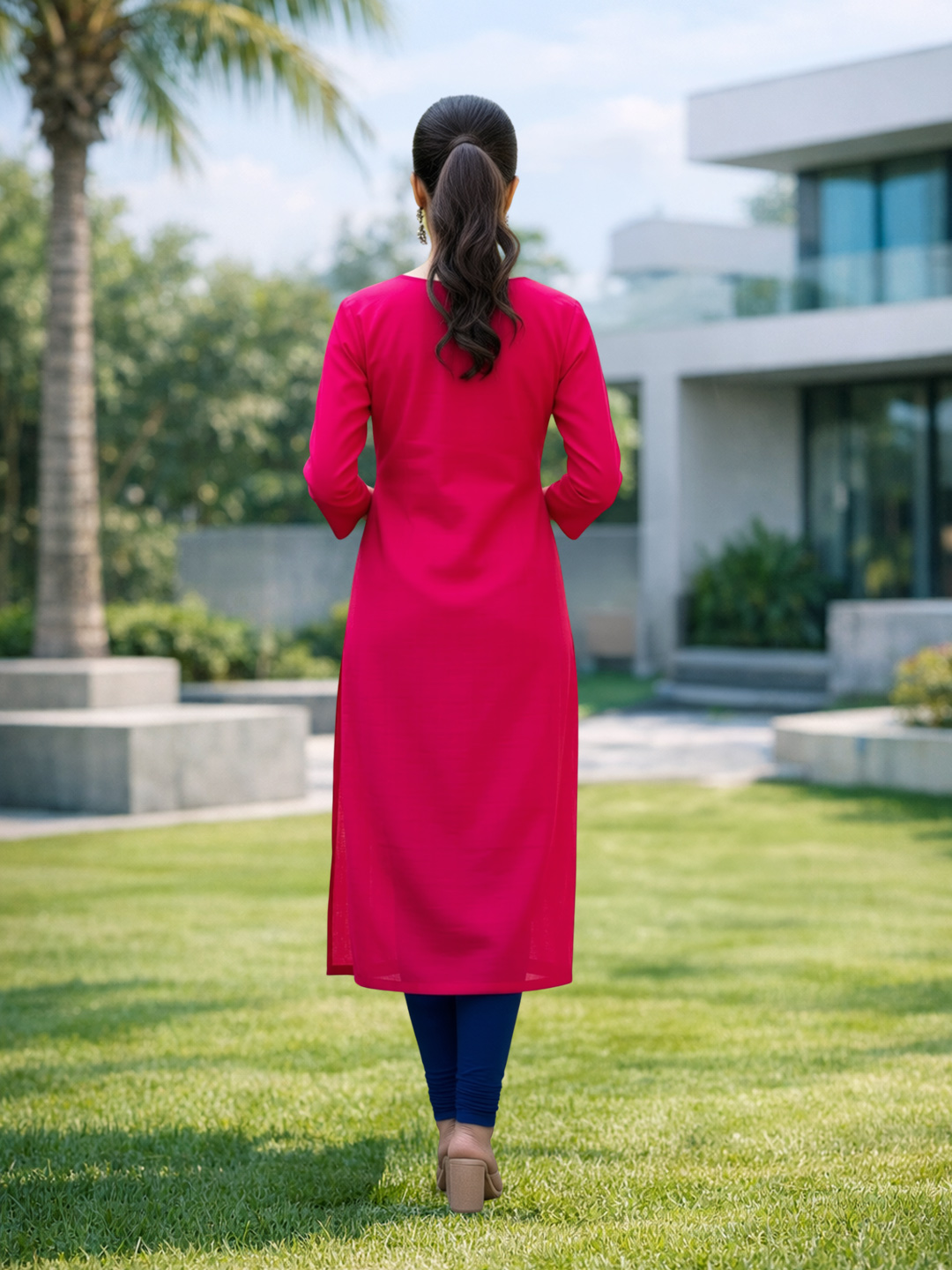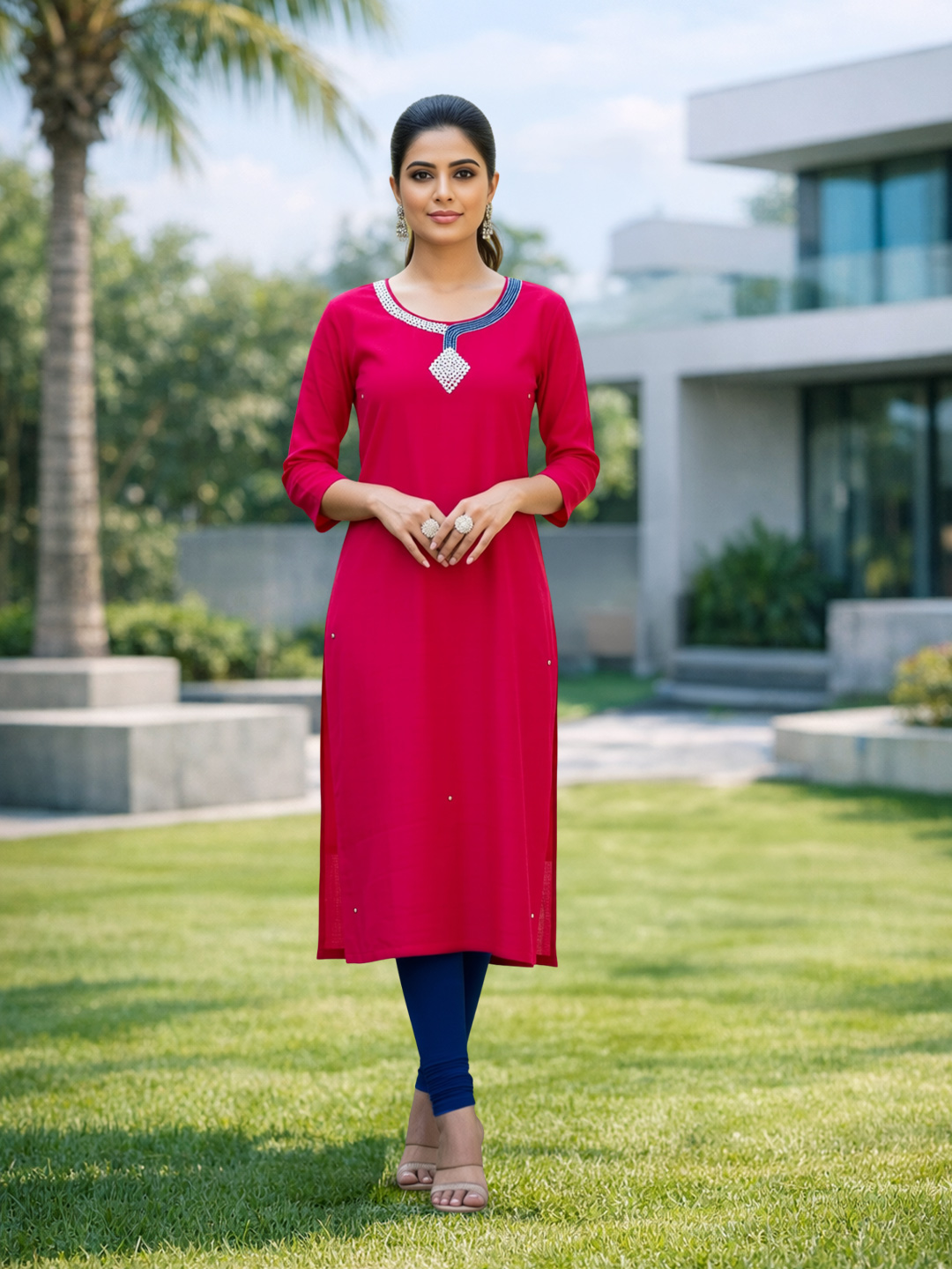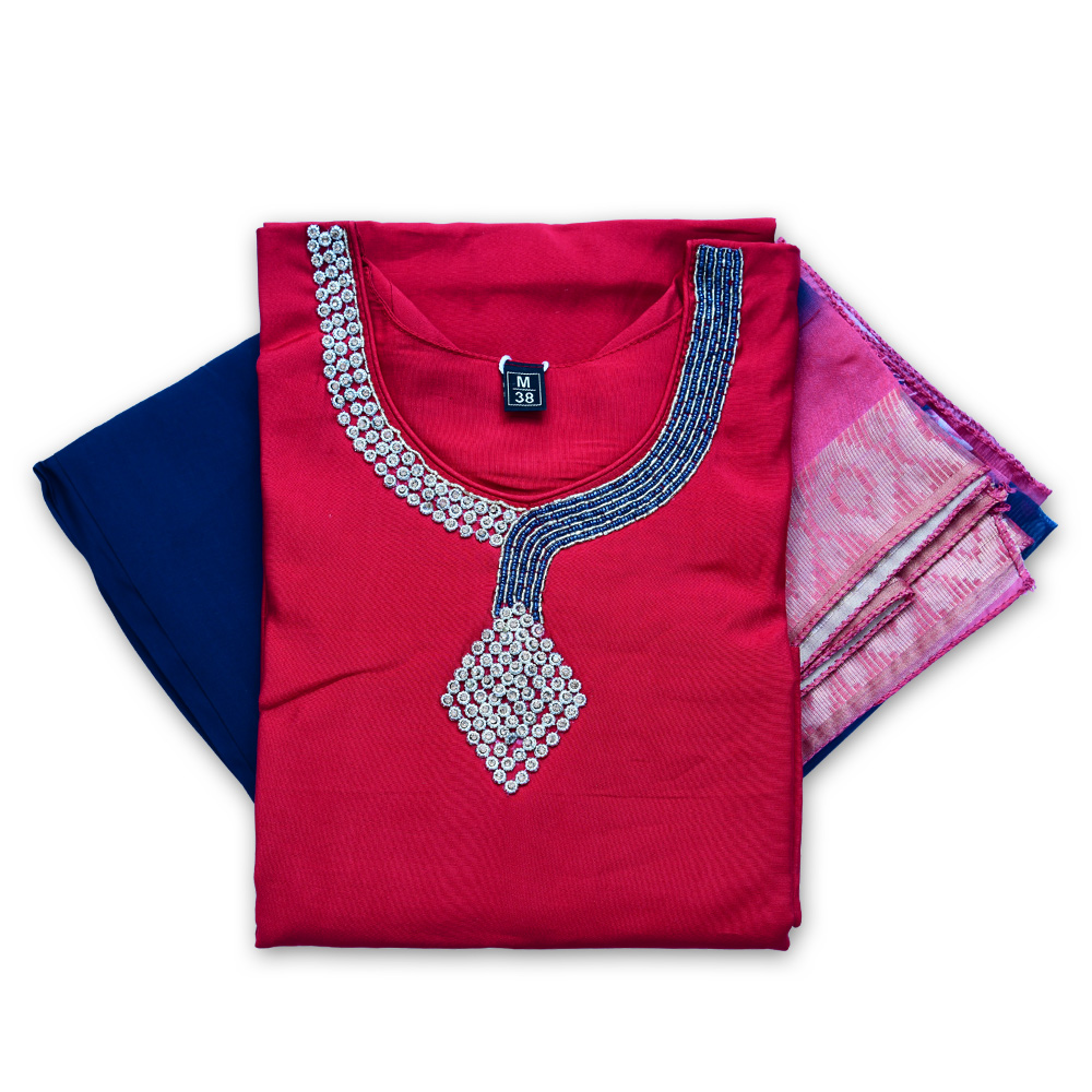 Keep it simple yet striking with this thoughtfully designed kurta set. The clean silhouette is enhanced by intricate neckline embellishments, offering a refined look without being too bold. Its breathable fabric makes it ideal for long hours, and the stylish dupatta adds a feminine, flowy appeal that completes the outfit beautifully.