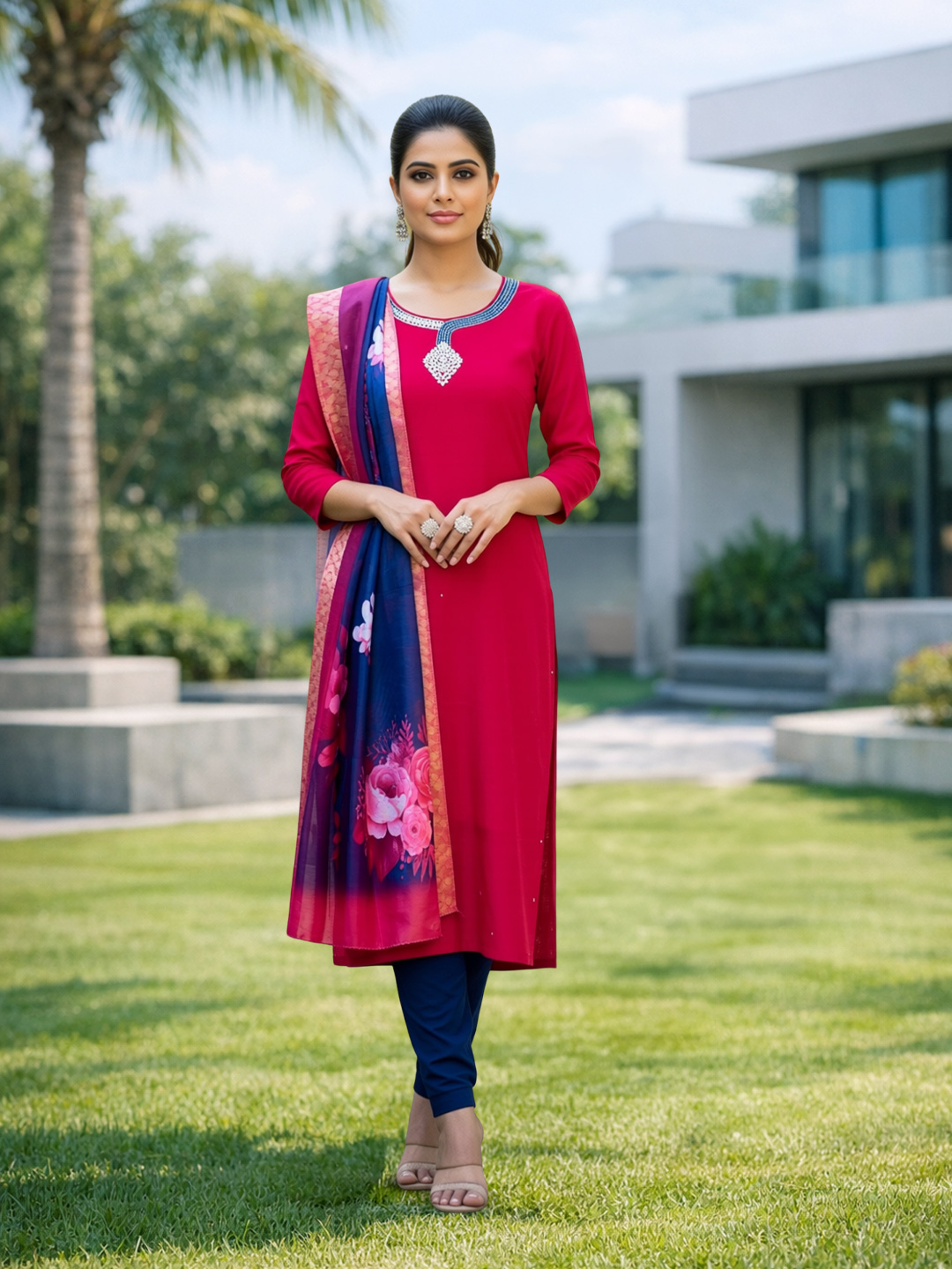 Upgrade your wardrobe with this elegant and easy-to-wear salwar suit set. The straight-cut kurta provides a flattering fit, while the soft fabric ensures unmatched comfort. The standout feature is the delicately embellished round neck yoke, paired with a charming floral dupatta that adds a refreshing and graceful vibe.