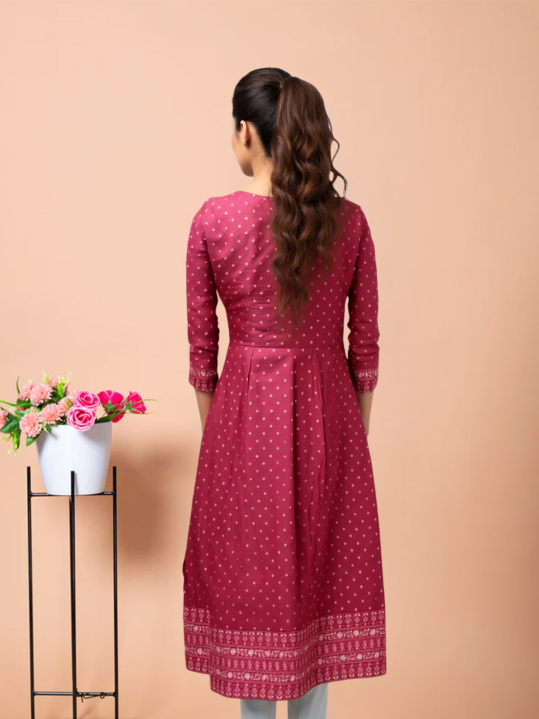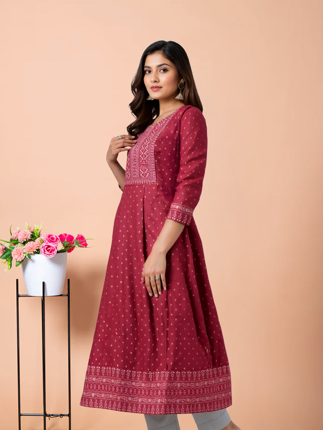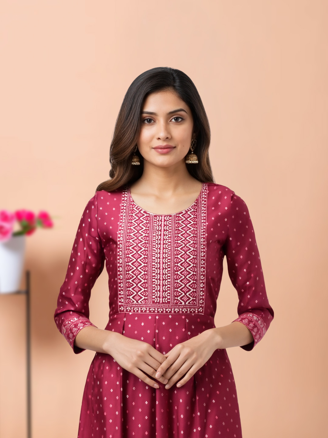 Designed for comfort and style, this Anarkali kurta features a classic round neck paired with a beautifully embroidered front yoke. The traditional ethnic print lends a rich cultural feel, while three-quarter sleeves with printed cuff accents complete the look. Lightweight and smooth fabric makes it perfect for daily wear or casual festive occasions.