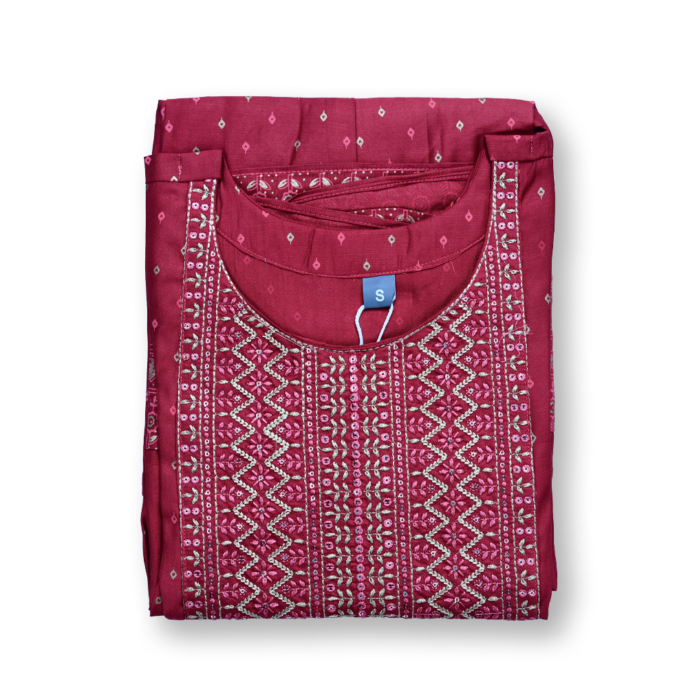 This kurta blends traditional prints with intricate embroidery for a refined ethnic look. The round neckline highlights the detailed embroidered yoke, while three-quarter sleeves are enhanced with printed cuff detailing. Crafted from breathable, skin-friendly fabric, it offers a graceful drape with unmatched comfort.