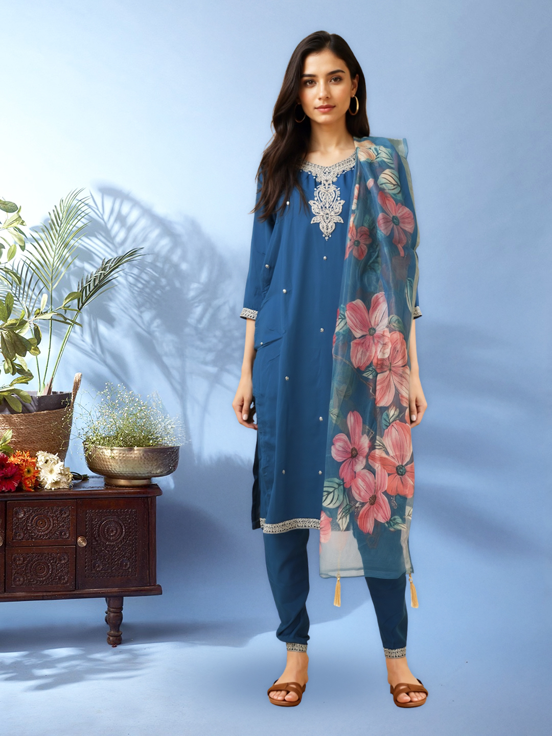 The soft, airy dupatta with coral floral prints adds a refreshing, feminine touch—perfectly balancing tradition with modern charm.