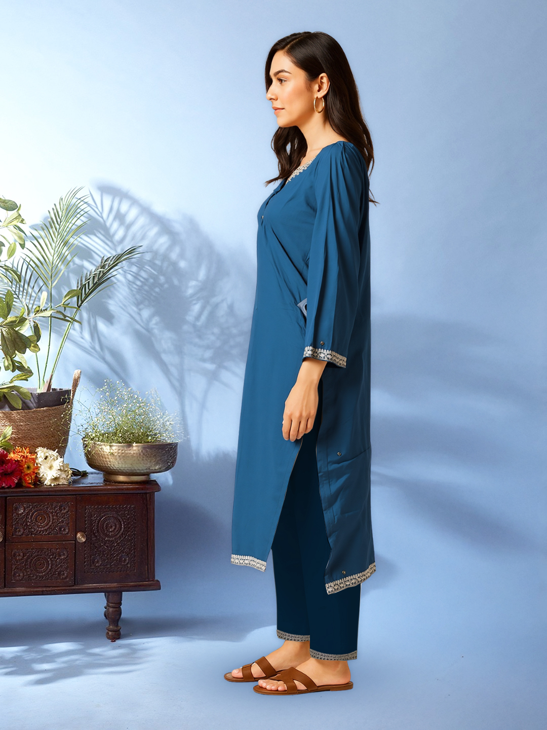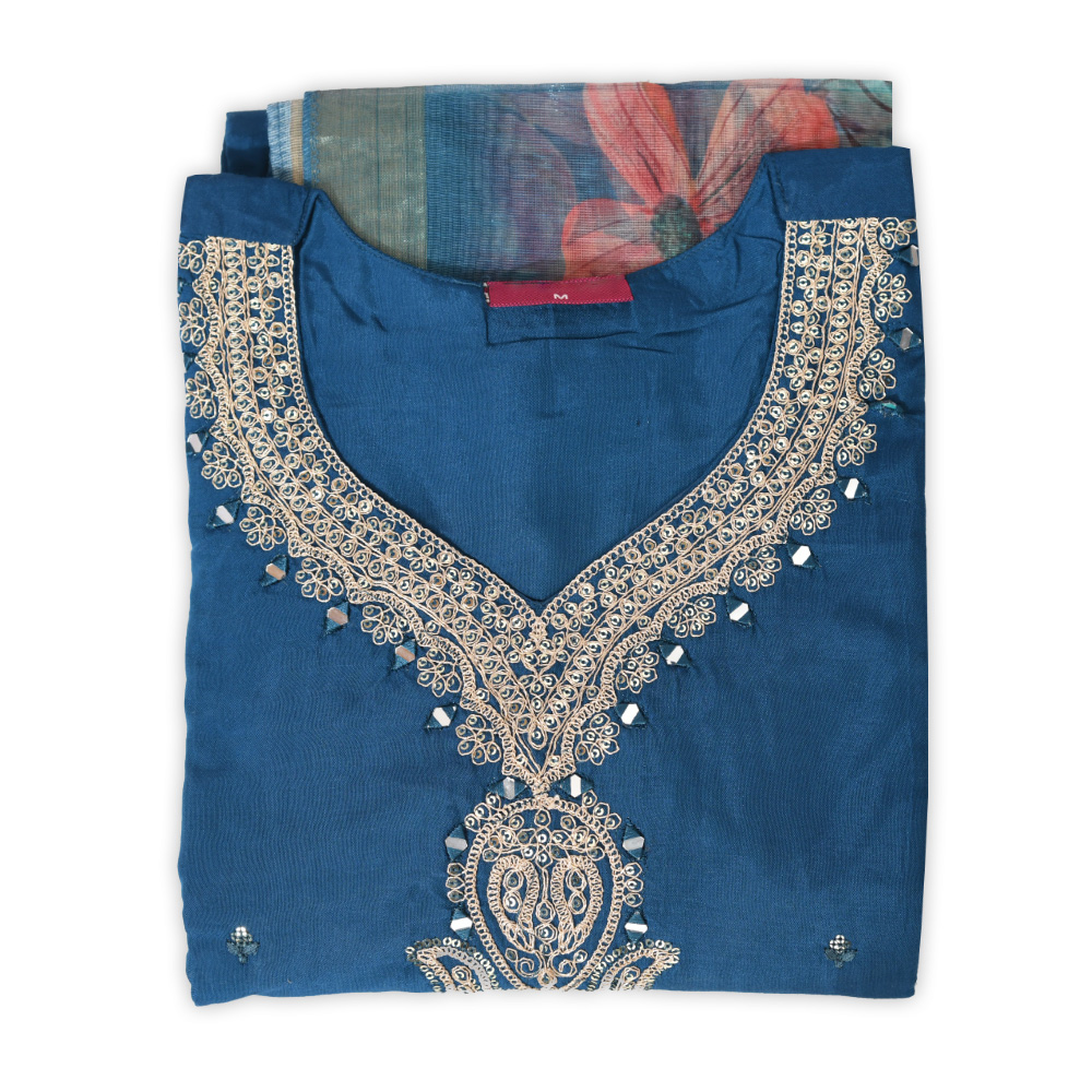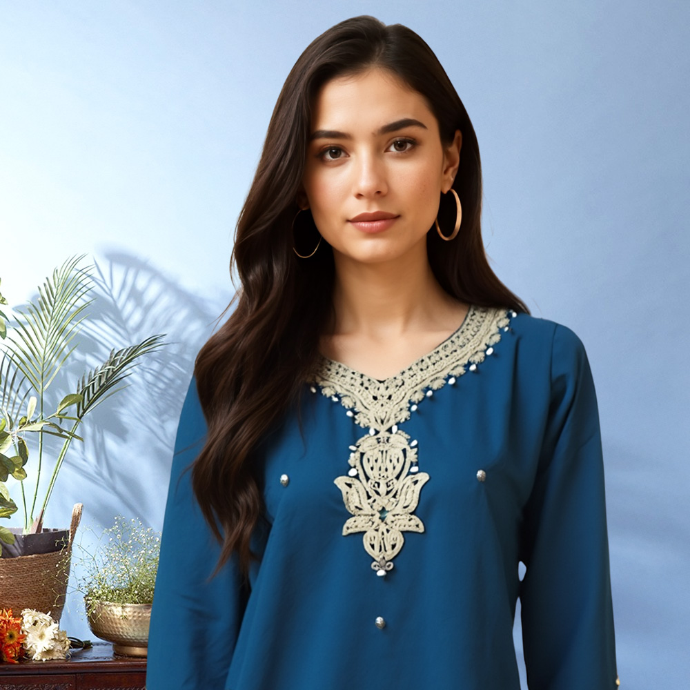 The heart shaped V neckline with an embroidered motif and 3/4th sleeves with a detailed trim create a sophisticated silhouette ideal for festive gatherings or elegant daywear.